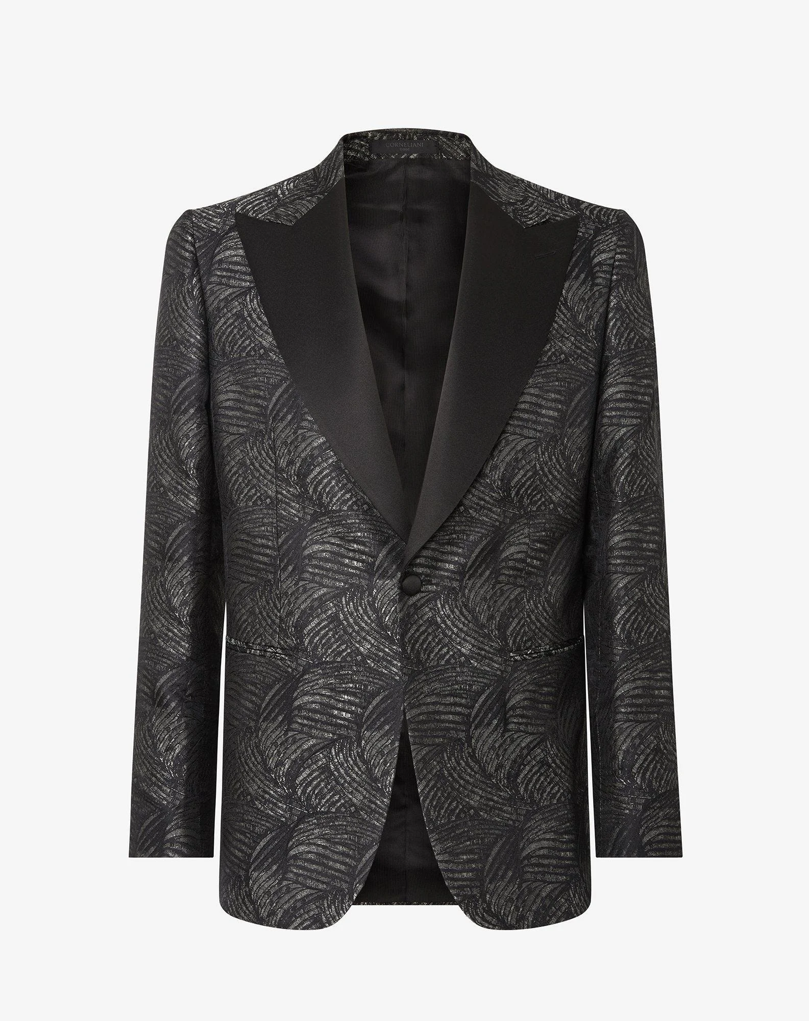 With its Corneliani Code formal menswear collection, Corneliani chooses the best in sartorial elegance to celebrate your special days and make them unforgettable. The sage green and black pure silk tuxedo jacket has a classic fit and side vents at the bac DETAILS & MATERIALS - 100% silk - single-breasted 1-button tuxedo jacket - lined - regular fit - pointy lapels - welt outbreast pocket - double welted side pockets - tonal smooth satin trim on lapels and covered buttons - double rear vent - tonal formal wear lining - lapel width 11 cm - bottom leng FIT & WASHING - This garment has a classic fit. The model is wearing a size 50 (IT). Model measurements: height 187cm, chest 98cm, waist 82cm, hips 98cm. Dry clean with perchloroethylene, do not bleach, maximum iron temperature 110A°, do not tumble dry