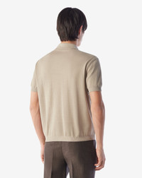 Sandy beige buttonless polo shirt made from fine lisle thread: light and breathable, it is the ideal fabric for the summer. Perfect for a sporty style that is also on point. DETAILS & MATERIALS - 100% cotton - short-sleeved buttonless polo shirt made from 60/2 gassed lisle thread with brioche stitch FIT & WASHING - The model is wearing a size 50 (IT). Model measurements: height 187cm, chest 98cm, waist 82cm, hips 98cm. Dry clean with perchloroethylene, do not bleach, maximum iron temperature 110A°, do not tumble dry