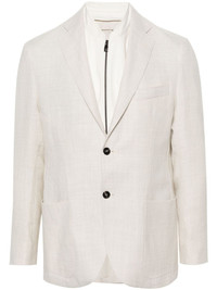 single-breasted layered blazer Highlights - Almond beige - Linen-wool blend - Layered design - Detachable panels - Notched lapels - Long sleeves - Buttoned cuffs - Chest welt pocket - Two front patch pockets - English rear vents - Internal pocket - Front button fastening Made in Italy Composition Outer: Polyester 100%, Linen/Flax 60%, Cotton 56%, Virgin Wool 40%, Polyamide 37%, Elastane 7% Lining: Viscose 100% SIZE & FIT Model measurements Height 6 ft 1 in(1.86 m) Bust/Chest 36.61 in(93 cm) Hips 37 in(94 cm) Waist 28.74 in(73 cm) FittingInformation Designed for a regular fit, allowing for a comfortably loose fit throughout the body The detachable panel offers the preference for a different fit Made from a midweight non-stretch fabric This piece fits true to size – take your usual size