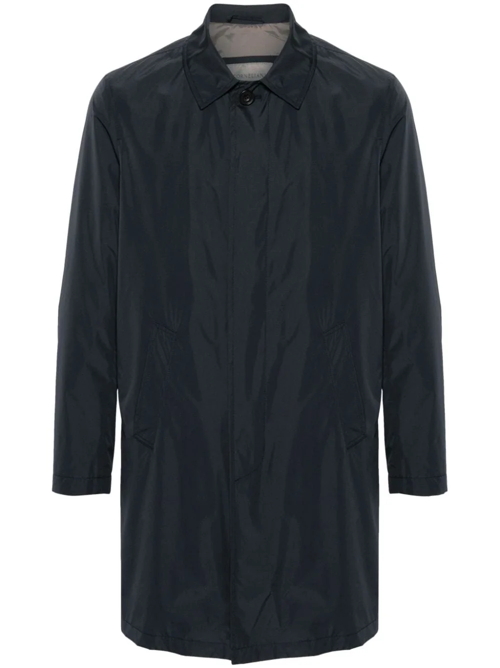 spread-collar buttoned raincoat Highlights - Navy blue - Shell - Water-resistant - Windproof - Spread collar - Concealed front button fastening - Long sleeves - Two side welt pockets - Central rear vent - Straight hem Made in Italy Composition Lining: Polyester 100% Outer: Polyester 100% SIZE & FIT Model measurements Height 6 ft 2 in(1.87 m) Bust/Chest 36.22 in(92 cm) Hips 37 in(94 cm) Waist 27.95 in(71 cm) FittingInformation Designed for a slim fit, offering a comfortable fit that sits just away from the body The vented hem offers movement at the rear Made from a midweight non-stretch fabric This piece fits true to size – take your usual size
