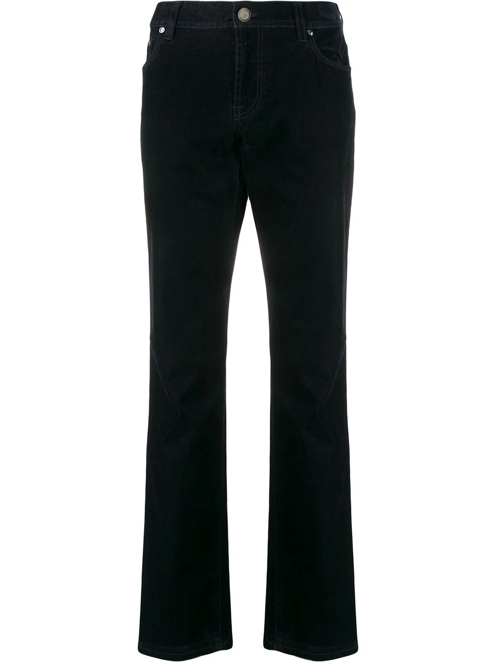 straight jeans Black cotton blend straight jeans from Corneliani featuring a button and zip fly, an embroidered logo to the front, a waistband with belt loops, a branded rear patch and a five pocket design. Made in Italy Composition Outer: Cotton 92%, Viscose 6%, Elastane 2% Lining: Polyester 65%, Cotton 35% SIZE & FIT Model measurements Height 6 ft 1 in(1.86 m) Bust/Chest 35.43 in(90 cm) Hips 35.43 in(90 cm) Waist 29.92 in(76 cm)