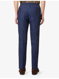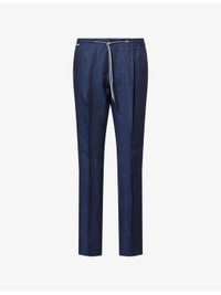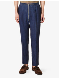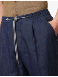 PRODUCT DETAILS - Corneliani linen trousers - 100% linen - Regular fit, mid-rise, straight leg, drawstring waistband, slip pockets at front, pockets at back, pressed centre creases - Dry clean - Model is 6ft 2in/1.88m and wears a size UK 40 - Lightweight, non-stretch Ref: R04457636