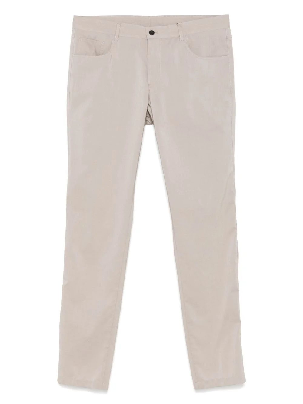 straight-leg trousers Highlights - Beige - Front button and zip fastening - Classic five pockets - Belt loops Imported Composition Outer: Cotton 53%, Silk 35%, Polyamide 10%, Elastane 2% Lining: Polyester 65%, Cotton 35% SIZE & FIT Model measurements Height 6 ft 2 in(1.88 m) Bust/Chest 37.4 in(95 cm) Hips 38.58 in(98 cm) Waist 31.1 in(79 cm) FittingInformation Designed for a slim tapered leg, offering a close fit that sits just away from the leg with a closer fit towards the ankle Made from a midweight non-stretch fabric Washing instructions Dry Clean Only