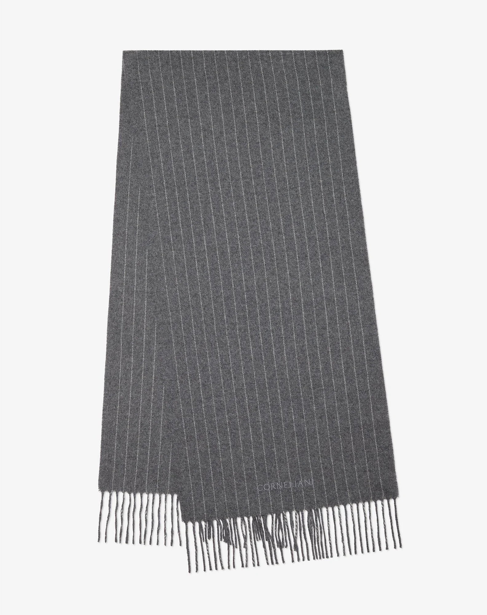 This jacquard virgin wool and cashmere scarf revisits the classic pin stripe pattern with contemporary minimalism. Its grey shade, soft feel and lightweight fringes enhance its classy elegance, completed by the embroidered logo DETAILS AND MATERIALS - 90% virgin wool, 10% cashmere - fringed jacquard scarf - embroidered logo - size: 37x180 cm - Made in Italy FIT & WASHING - Dry clean with perchloroethylene, do not bleach, do not tumble dry, maximum iron temperature 110°