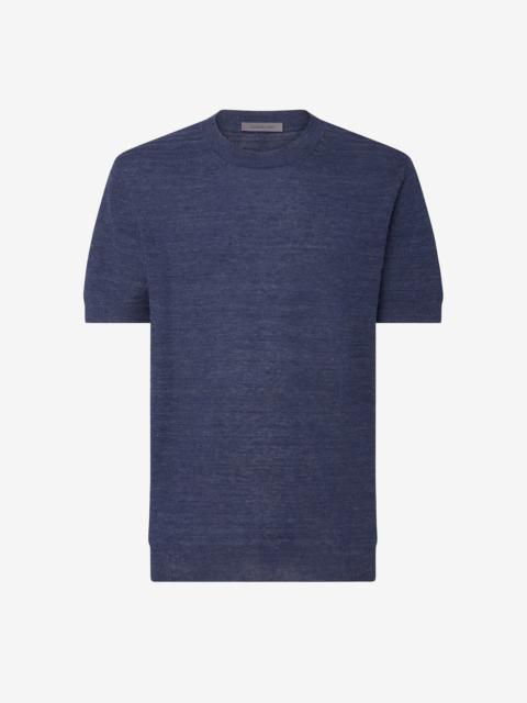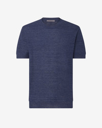 Simple yet sophisticated, this denim blue short sleeve crew neck jumper is crafted from a silk and linen blend. A comfortable everyday jumper, it is entirely made in Italy. DETAILS & MATERIALS - 70% linen, 30% silk - short-sleeved crew neck knitwear - made in Italy FIT & WASHING - The model is wearing a size 50 (IT). Model measurements: height 187cm, chest 98cm, waist 82cm, hips 98cm. Dry clean with perchloroethylene, do not bleach, maximum iron temperature 110A°, do not tumble dry