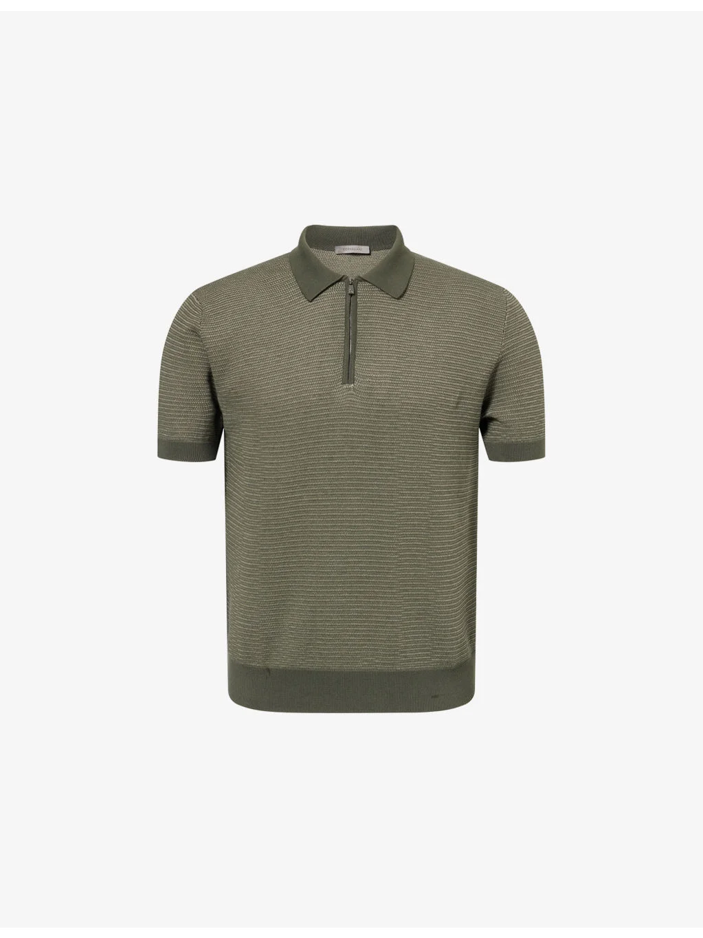 PRODUCT DETAILS - Corneliani cotton-knit polo shirt - 100% cotton - Concealed zip fastening at front - Polo collar - Mitered cuffs - Regular fit, collar, short sleeves, all-over knitted, textured, striped print, contrast ribbed trims - Hand wash cold - Made in Italy - Model is 6ft 2in/1.88m and wears a size UK 40 - Midweight, stretchy Ref: R04560450