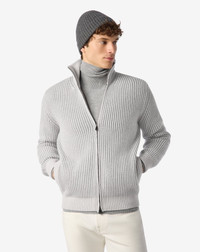 Elegant and functional, this full-zip, long-sleeve jumper made from sublime Cashmere and ultra fine merino wool features a two-tone grey ribbed knit pattern. The garment's bodied and soft structure ensures a comfortable fit with natural heat retention, while the fisherman's rib work provides a refined tactile and visual effect. Fully made in Italy, this garment is SFA- and OEKO- TEX-certified to guarantee quality, sustainability and safety for your skin. The practical pockets and full zip make this the perfect jumper for the contemporary man who seeks both style and functionality. DETAILS AND MATERIALS - 60% cashmere, 40% virgin wool - full zip long-sleeved jumper with pockets made from two-tone rib knit Sublime Cashmere - 5 gauge - Made in Italy FIT & WASHING - Dry clean with perchloroethylene, do not bleach, do not tumble dry, maximum iron temperature 110°