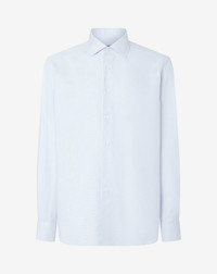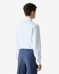 White and light blue textured cotton shirt. A sober and refined style, designed to interpret everyday life with discreet elegance. This long-sleeved shirt is made from pure woven cotton, with a micro weave that enhances its texture and adds chromatic depth to the white and light blue fabric. The Italian collar and rounded cuffs define a classic yet contemporary style, suitable for both business and leisure. The regular fit ensures balance and comfort, achieving a naturally refined look. DETAILS AND MATERIALS - 100% cotton - long sleeve textured cotton shirt with micro structure - regular fit - straight point collar - rounded cuffs FIT & WASHING - This garment has a regular fit. The model is wearing a size 41 (IT). Model’s measurements: height 187cm, chest 98cm, waist 82cm, hips 98cm. Maximum wash temperature 40°, do not bleach, dry clean with perchloroethylene, do not tumble dry, maximum iron temperature 150°
