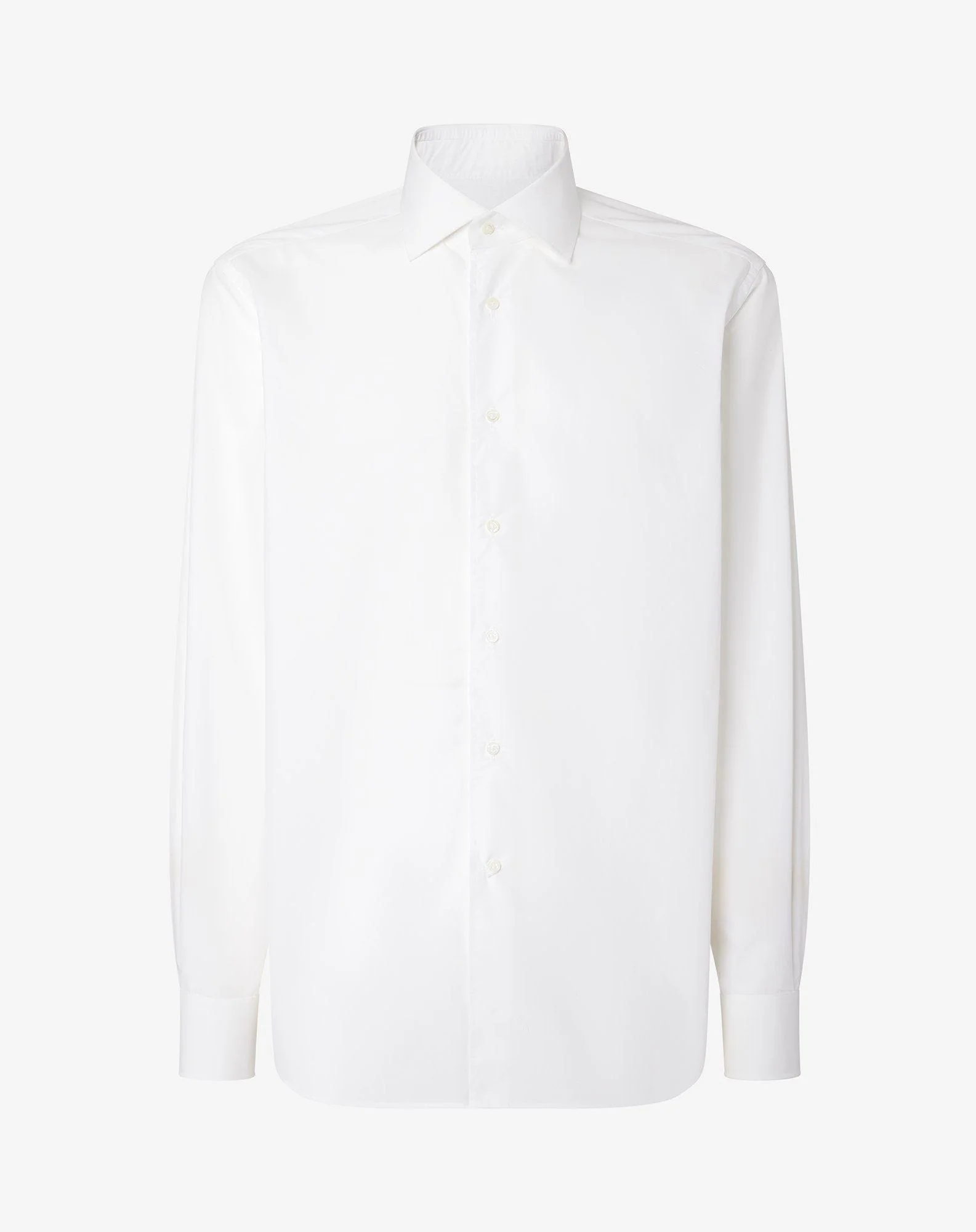 Essential and impeccable, this white pure cotton poplin shirt is a pillar of the men's wardrobe. The compact and smooth texture of the fabric ensures a fresh and pleasant feel on the skin, perfect for both everyday use and formal occasions. The design is defined by a regular fit, an Italian collar with clean lines and rounded cuffs that enhance its versatility and discreet elegance. A timeless classic, made in Italy, that interprets contemporary style with balance. DETAILS AND MATERIALS - 100% cotton - long sleeve cotton poplin shirt - regular fit - straight point collar - rounded cuffs FIT & WASHING - This garment has a regular fit. The model is wearing a size 41 (IT). Model’s measurements: height 187cm, chest 98cm, waist 82cm, hips 98cm. Maximum wash temperature 40°, do not bleach, dry clean with perchloroethylene, do not tumble dry, maximum iron temperature 150°