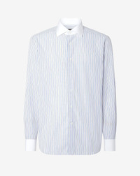 A classic revisited with elegance and lightness. This long-sleeved white pure cotton poplin shirt, enhanced by a refined blue and light blue striped pattern, combines tradition and contemporary freshness. Its regular fit guarantees comfort and versatility, while the Italian collar and rounded cuffs, both in white, add a refined contrast that enhances every tailored detail. An essential garment for a sophisticated and timeless men's wardrobe. DETAILS AND MATERIALS - 100% cotton - long sleeve cotton poplin shirt - regular fit - white Italian collar - white rounded cuffs FIT & WASHING - This garment has a regular fit. The model is wearing a size 41 (IT). Model’s measurements: height 187cm, chest 98cm, waist 82cm, hips 98cm. Maximum wash temperature 40°, do not bleach, do not dry clean, do not tumble dry, maximum iron temperature 150°