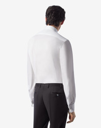 With its Corneliani Code formal menswear collection, Corneliani chooses the best in sartorial elegance to celebrate your special days and make them unforgettable. A timeless staple of every man's wardrobe, the white cotton formal shirt with micro stripe and double cuffs for cuff links is always the perfect choice for every formal outfit. DETAILS AND MATERIALS - 100% cotton - long sleeve cotton shirt with tone-on-tone micro stripe - wing tip collar - regular fit - concealed buttons - double cuffs for cuff links FIT & WASHING - The model is wearing a size 41 (IT). Model measurements: height 187cm, chest 98cm, waist 82cm, hips 98cm.