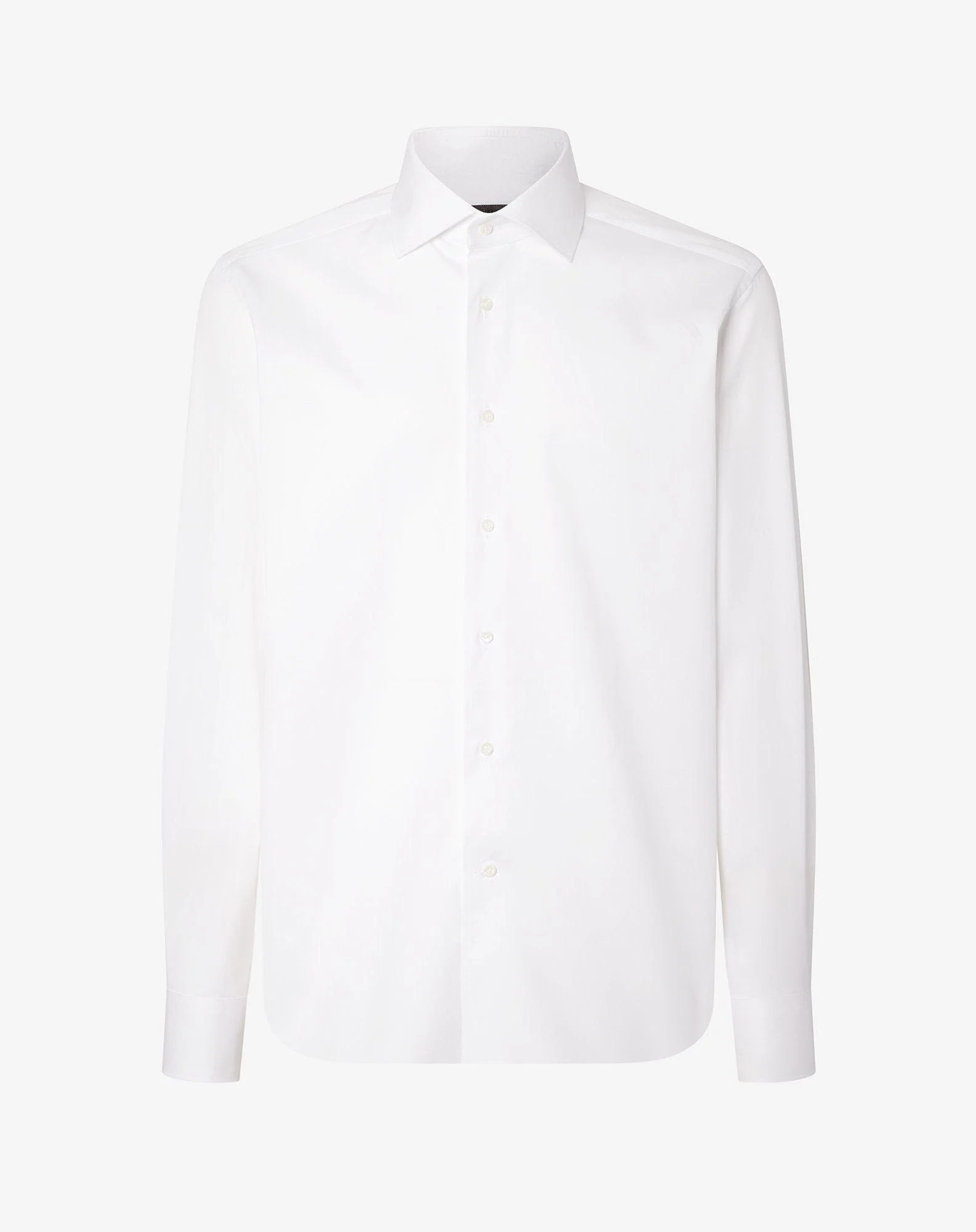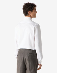 Made from fine pure cotton twill, this white shirt strikes an impeccable balance between elegance and everyday functionality. The compact and naturally shiny texture of the fabric enhances the depth of the colour and creates a pleasant sensation on the skin. The classic design with Italian collar, rounded wrist and regular fit adapts effortlessly to any occasion, from formal business to refined leisure. An essential piece of men's wardrobe, finished according to the canons of the best Italian tailoring tradition. DETAILS AND MATERIALS - 100% cotton - long-sleeved cotton twill shirt - regular fit - straight point collar - rounded cuffs FIT & WASHING - This garment has a regular fit. The model is wearing a size 41 (IT). Model’s measurements: height 187cm, chest 98cm, waist 82cm, hips 98cm. Maximum wash temperature 40°, do not bleach, dry clean with perchloroethylene, do not tumble dry, maximum iron temperature 150°