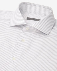 A wardrobe staple revisited in a contemporary key. This white shirt with grey stripes is made of cotton twill with a stretch component, which combines the natural appeal of the fibre with dynamic and impeccable comfort all day long. Its long-sleeved design with regular fit ensures ease of movement, while the French collar and rounded cuffs complete the garment with understated, versatile elegance. DETAILS AND MATERIALS - 72% cotton, 25% polyamide, 3% elastane - long-sleeved cotton twill shirt - regular fit - French collar - rounded cuffs FIT & WASHING - This garment has a regular fit. The model is wearing a size 41 (IT). Model’s measurements: height 187cm, chest 98cm, waist 82cm, hips 98cm. Maximum wash temperature 40°, do not bleach, dry clean with perchloroethylene, do not tumble dry, maximum iron temperature 110°