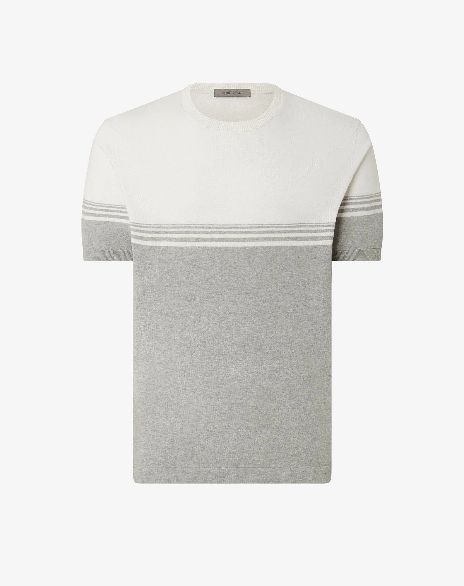Simple yet sophisticated, this white and grey short sleeve crew neck jumper is crafted from a silk and linen blend. A comfortable everyday jumper, it is entirely made in Italy. DETAILS & MATERIALS - 83% cotton, 17% silk - short sleeve crew neck knitwear made from colour block striped cotton and silk - 14 gauge - Made in Italy FIT & WASHING - The model is wearing a size 50 (IT). Model measurements: height 187cm, chest 98cm, waist 82cm, hips 98cm. Dry clean with perchloroethylene, do not bleach, maximum iron temperature 110°, do not tumble dry