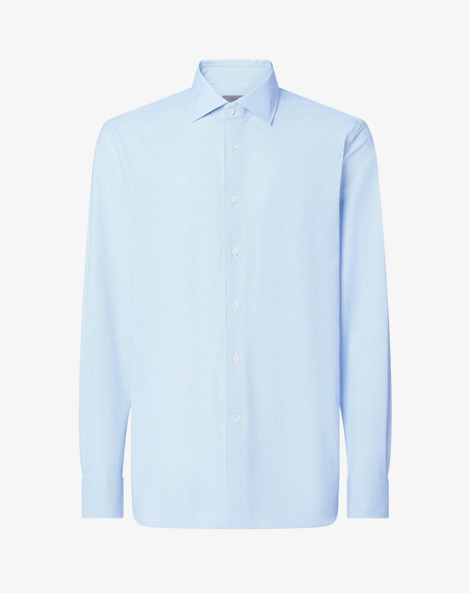 Designed to accompany everyday life with style and functionality, this micropatterned white and blue shirt is crafted from a refined bi-elastic fabric, which ensures comfort and freedom of movement all day long. The understated micro pattern adds a contemporary touch to the look, while the small Italian collar and regular fit radiate minimalist elegance. Its mix of technical fibres makes it durable, breathable and ideal for a dynamic wardrobe, where performance meets sartorial taste. DETAILS AND MATERIALS - 75% polyamide, 25% elastane - long-sleeved bi-elastic technical fabric shirt - regular fit - small Italian collar FIT & WASHING - This garment has a regular fit. Dry clean with perchloroethylene, do not bleach, do not tumble dry, maximum iron temperature 110°