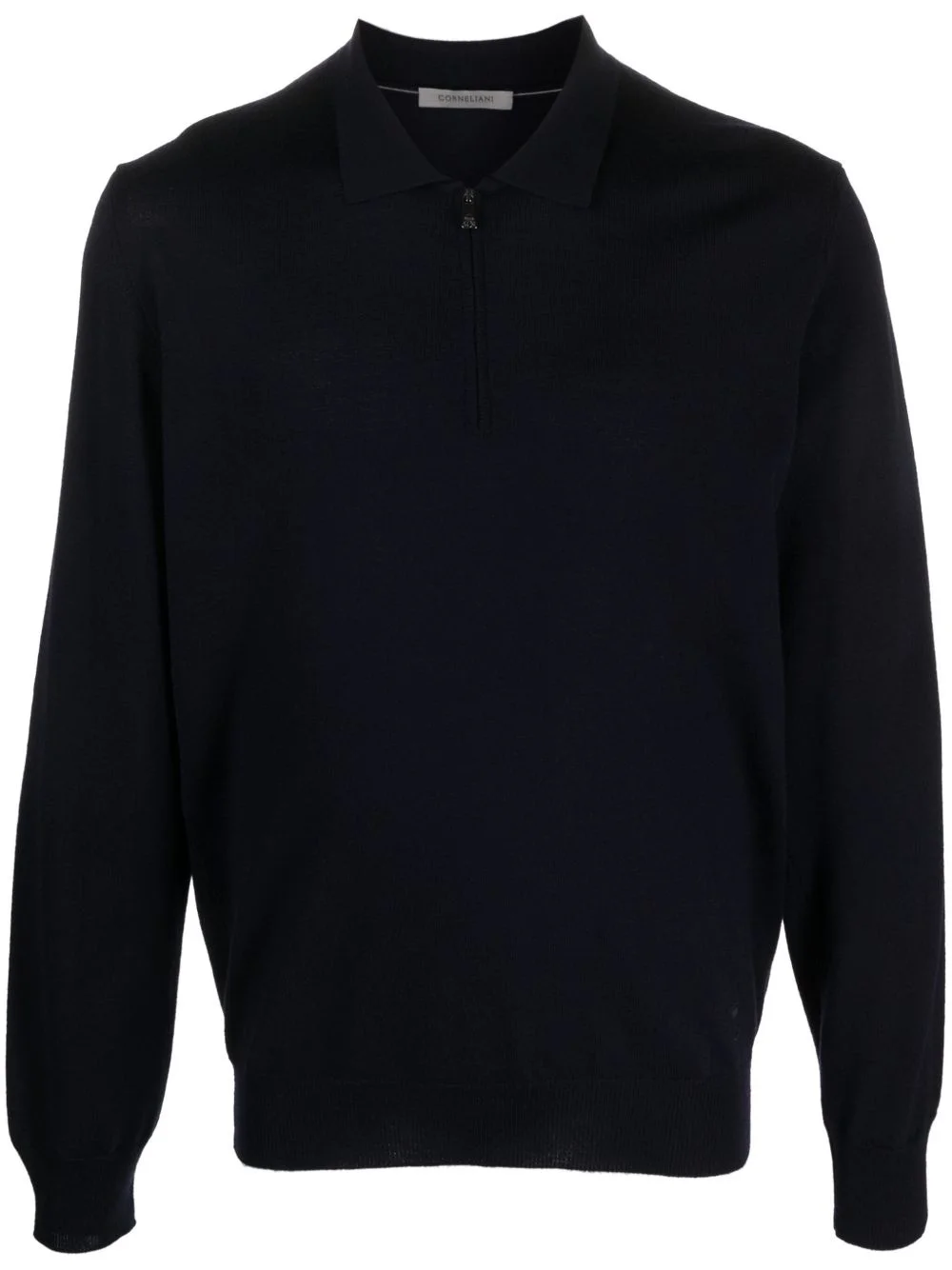 zip-up virgin-wool polo shirt Spun from fine virgin wool, this Corneliani polo shirt sees a contemporary take on the classic silhouette, replacing the button placket with a zipped closure. Highlights - Midnight blue - Virgin wool - Polo collar - Short front zip fastening - Long sleeves - Straight hem Made in Italy Composition Virgin Wool 100% SIZE & FIT Model measurements Height 6 ft 2 in(1.87 m) Bust/Chest 38.18 in(97 cm) Hips 36.61 in(93 cm) Waist 29.13 in(74 cm) FittingInformation Designed for a relaxed fit, this polo shirt offers comfort and movement The ribbed hem offers a close, comfortable fit Made with a midweight knit, this piece offers some stretch This piece fits true to size – take your usual size Washing instructions Hand Wash