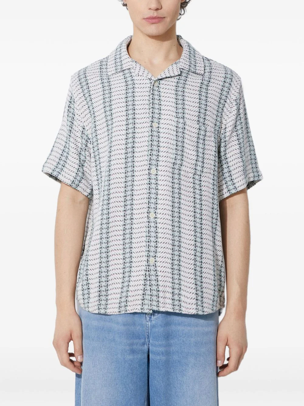 herringbone-patter shirt Highlights - White - Herringbone pattern - Short sleeves - Polo collar - Button fastening - Patch pocket Imported Composition Cotton 100% Washing instructions Read Manufacturer Guidelines