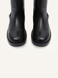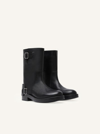 Leather "Americana" style mid boots. Metallic buckles on the sides and leather loop with silver AC logo on the back.mid-calf height with inside zipper. Leather lining Stem: 24.5 cm Heel: 4.5 cm DETAILS Composition: 100% calfskin Country of Manufacture: IT SKU: 324SAB031CR00689999 Color: Black