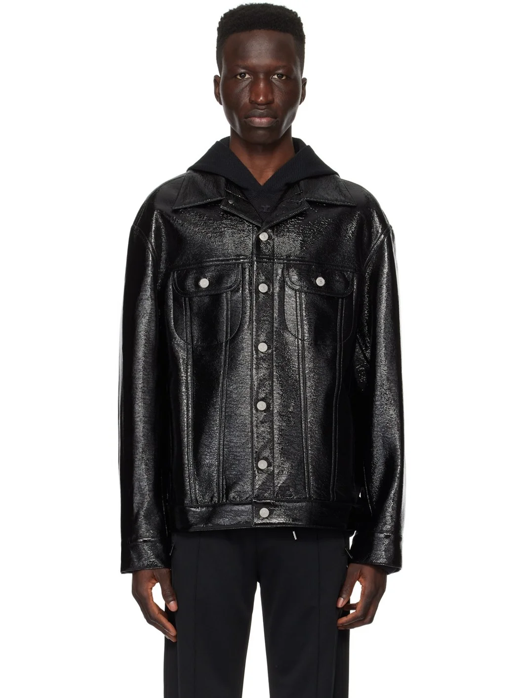 Crinkled cotton- and polyurethane-blend vinyl jacket. · Open spread collar · Button closure · Flap and welt pockets · Single-button barrel cuffs · Adjustable button tabs at back hem · Welt pocket at interior · Full cupro satin lining Supplier color: Black Body: 88% cotton, 10% polyurethane, 2% elastane. Lining: 100% cupro. Made in Serbia 241783M180009
