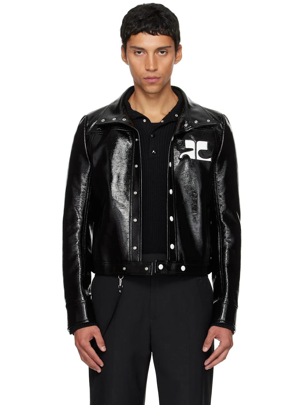 Crinkled stretch vinyl jacket. · Spread collar · Press-stud closure · Inset faux-leather logo patch at chest · Welt pockets at waist · Press-stud barrel cuffs · Welt pocket at interior · Full satin lining Part of the Reedition collection. Supplier color: Black Body: 88% cotton, 10% polyurethane, 2% elastane. Trim: 55% polyamide, 25% polyurethane, 20% elastane. Lining: 100% cupro. Made in Slovakia (Slovak Republic) 252783M180000