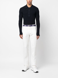 bootcut twill tailored trousers white twill weave pressed crease embroidered logo belt loops button fly fastening classic five pockets bootcut Made in France Composition Lining: Cotton 100% Outer: Polyester 83%, Acetate 17% SIZE & FIT Model measurements Height 6 ft 2 in(1.88 m) Bust/Chest 36.61 in(93 cm) Hips 37.79 in(96 cm) Waist 28.74 in(73 cm) Washing instructions Dry Clean Only