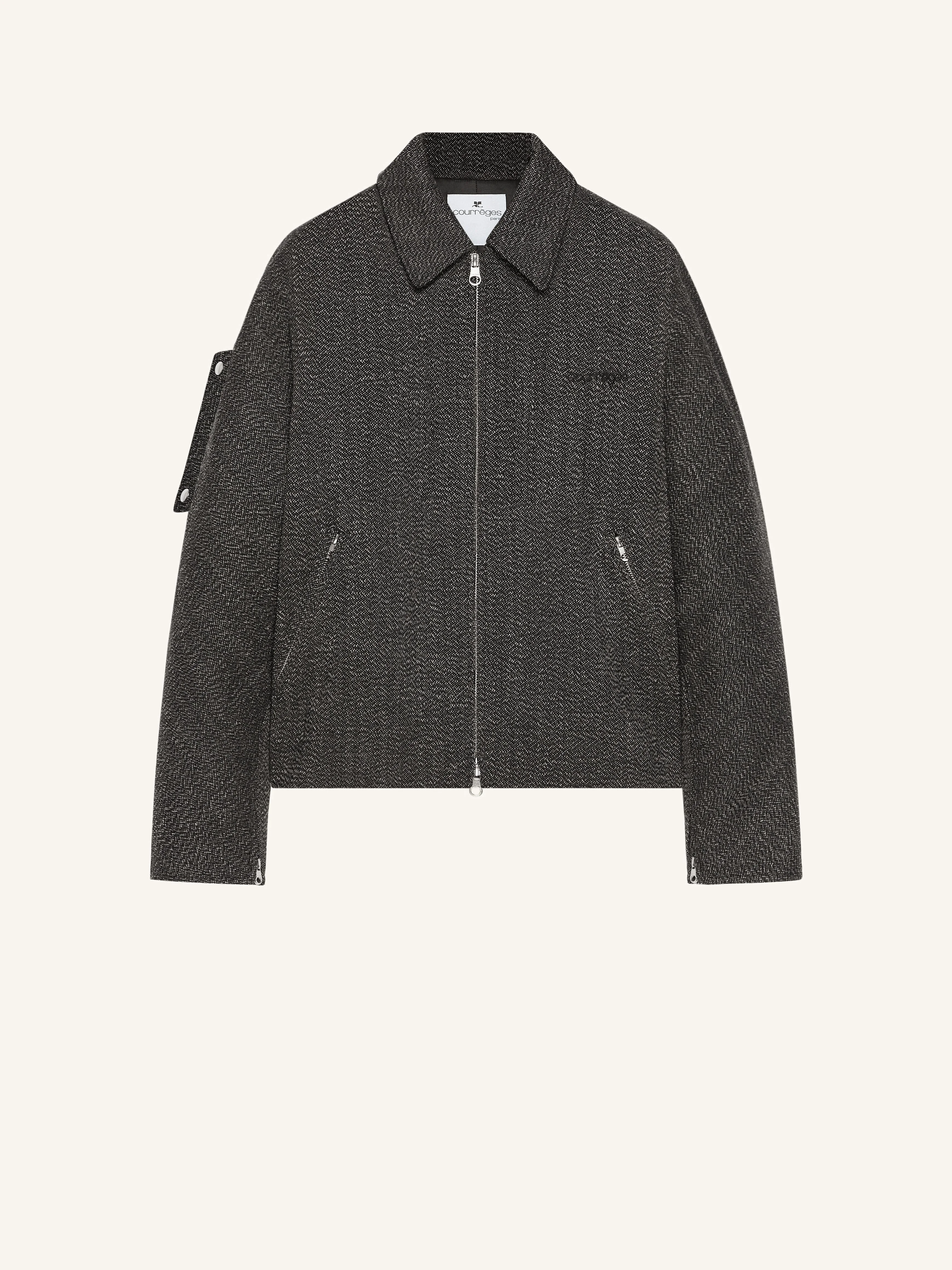Zipped caviar wool bomber jacket with shirt collar, rib-knit in the back, and side pockets. Embroidered "Courreges" logo at chest and zipped sleeves. This item is unisex. The model is 1.88m tall and wears size M. DETAILS Composition: 100% wool Country of Manufacture: LT SKU: 325CBL308WO01449901 Color: Black/Heritage White