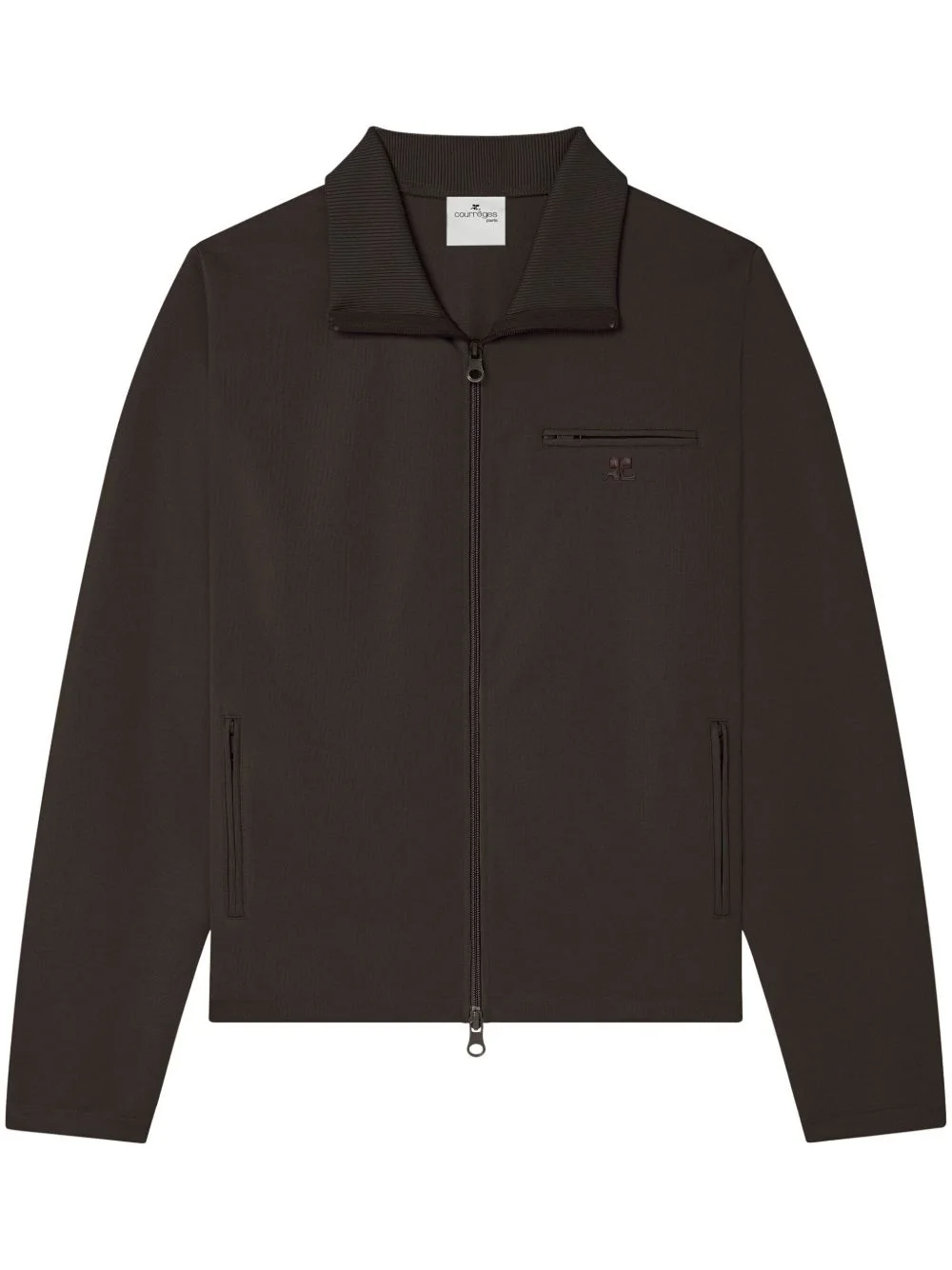 logo-embroidered jersey jacket Highlights - Chocolate brown - Jersey texture - Stand-up collar - Long sleeves - Zip-fastening chest pocket - Embroidered logo at the chest - Front zip fastening pockets - Straight hem - Front two-way zip fastening Imported Composition Polyester 100% Washing instructions Read Manufacturer Guidelines