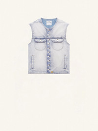Denim sleeveless trucker jacket with metallic multiflex, round pockets, AC logo and welt pockets. DETAILS Composition : 100% Coton Pays de fabrication : Tunisie Couleur : Bleu Clair Code Article : 124DBL151DE0016