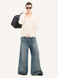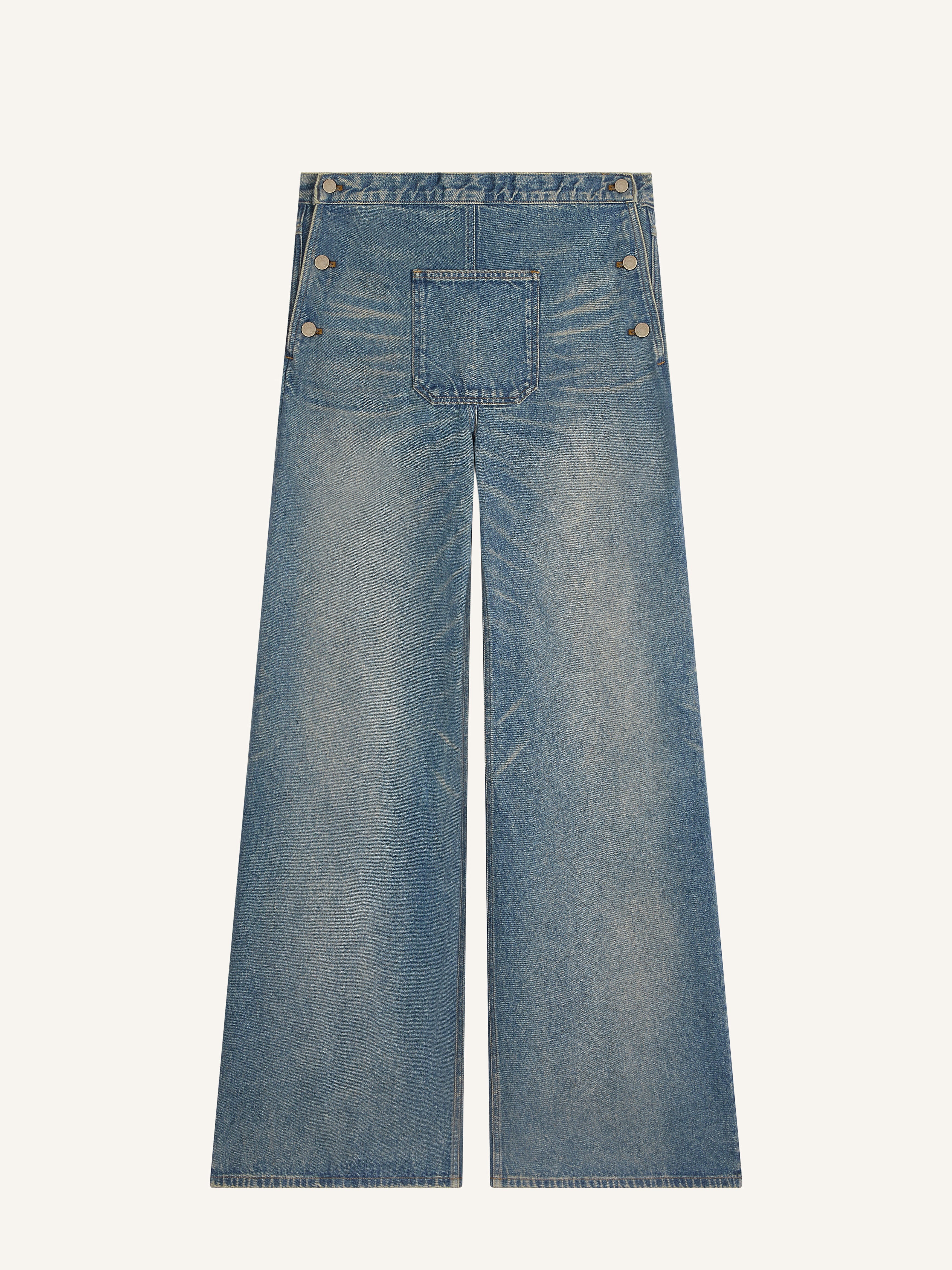 Baggy denim pants with a centered front pocket and denim buttons at the hips. This item is unisex. The female model measures 1.75m and wears a size 26. The male model measures 1.88m and wears a size 28. DETAILS Composition: 100% cotton Country of Manufacture: IT SKU: 324DPA238DE00337052 Color: Vintage Medium Blue
