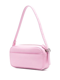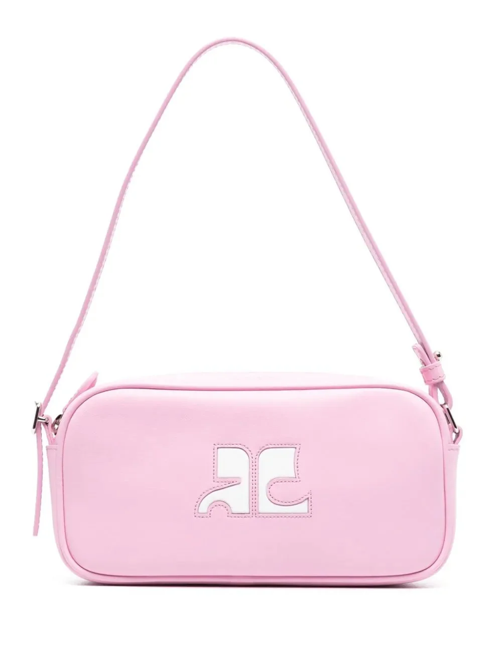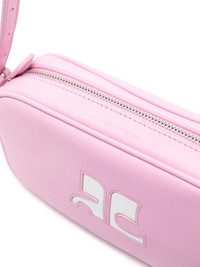 REEDITION LEATHER SHOULDER BAG FROM COURREGES FEATURING BLUSH PINK, CHALK WHITE, CALF LEATHER, SMOOTH GRAIN, DEBOSSED LOGO TO THE FRONT, INTERNAL LOGO PATCH, TONAL STITCHING, TOP ZIP FASTENING, ADJUSTABLE SHOULDER STRAP, SLIP POCKET TO THE REAR, INTERNAL SLIP POCKET AND CANVAS LINING.