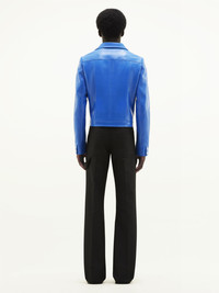 Inspired by the house's emblematic 1971 style, this iconic vinyl jacket features a white AC logo inlaid on the chest. With two side pockets and a press buttons closure in the middle front and on the cuffs, as well as a high collar. This model is lined. The cut of the vinyl jacket from the Reeditions collection is close to that of the iconic model from 1971. It is a tight fit and was designed to be worn open. For more ease, we recommend that you choose the next size up from your usual size. DETAILS Composition : 88% COTON 10% POLYURETHANE 2% ELASTHANE 55% POLYAMIDE/NYLON 25% POLYURETHANE 20% ELASTHANE 100% CUPRO Color : Blue Item code : PERCBL017VY00147050