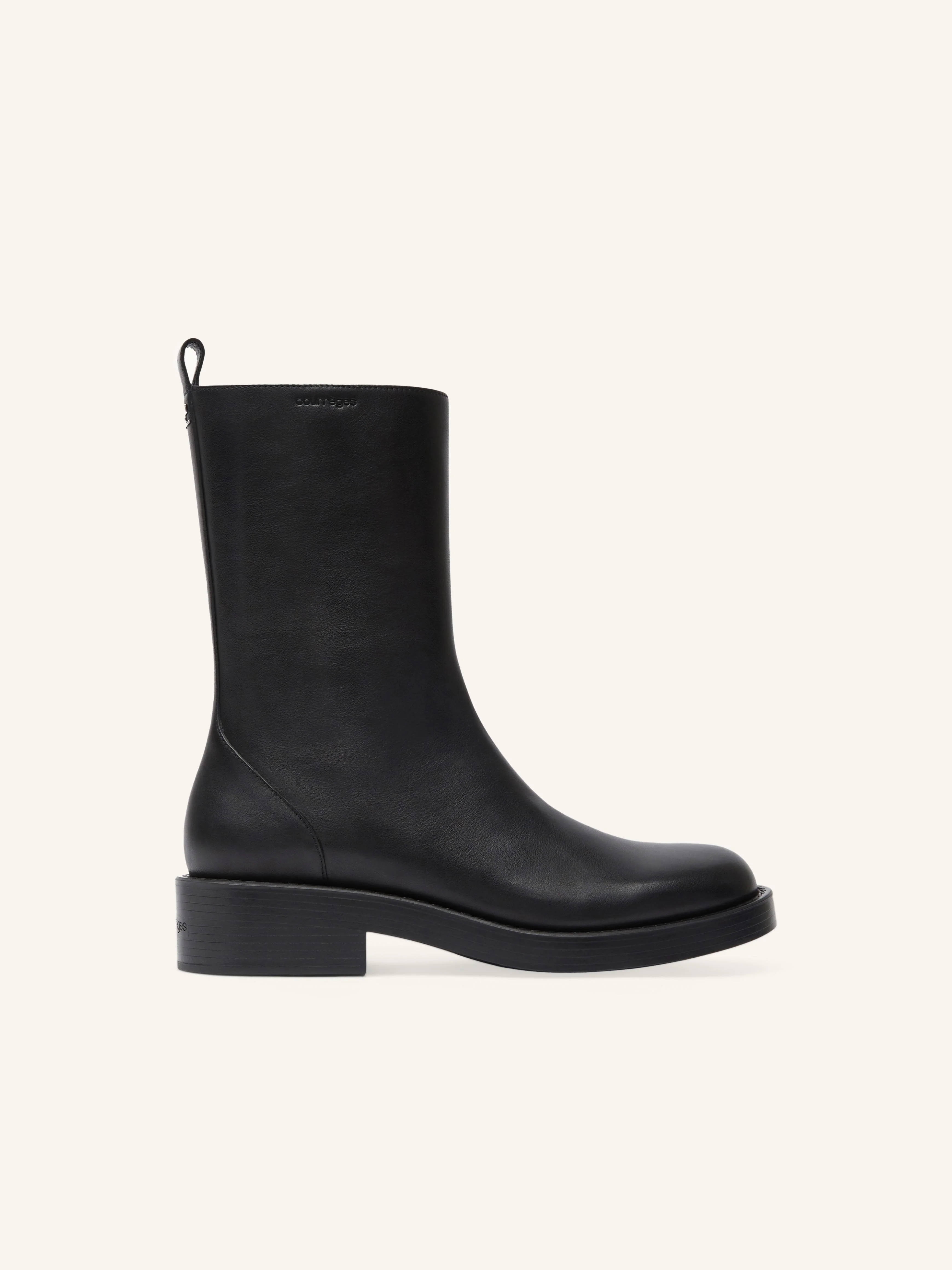 Leather "Biker" style mid boots with internal zipper and elastic on the side. Leather lining. Back leather loop with metal AC logo on the back. Stem: 27 cm Heel: 4.5 cm DETAILS Composition: 100% calfskin Country of Manufacture: IT SKU: VESSAB012CR00689999 Color: Black