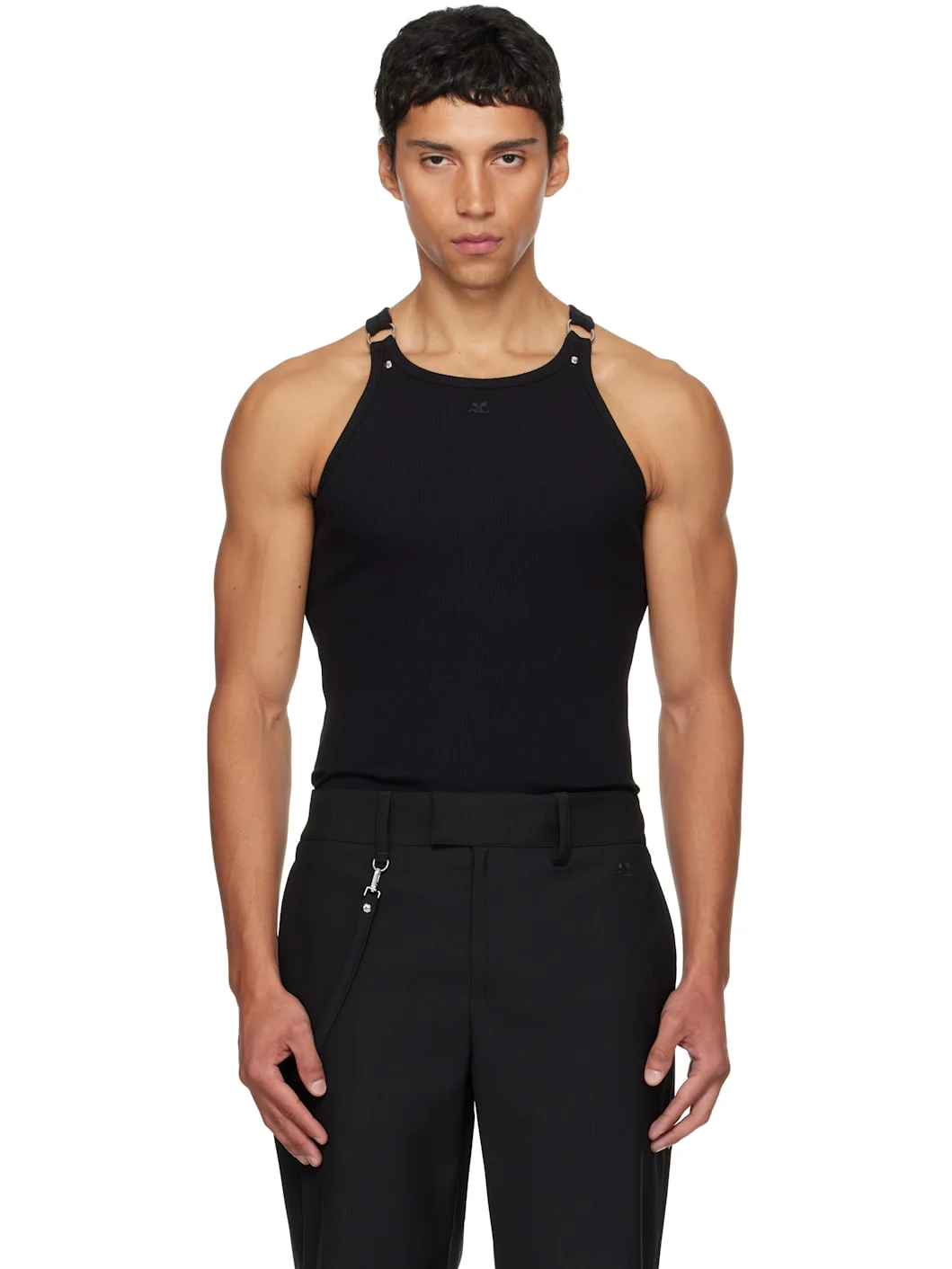 Stretch cotton ribbed jersey tank top. · Scoop neck · Logo embroidered at chest · Round hem · Rivet and O-ring at fixed shoulder straps Supplier color: Black 98% cotton, 2% elastane. Made in Portugal 252783M214000