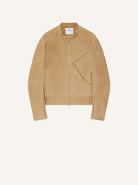 Zipped scuba biker suede jacket with zipped pockets and suede wire at the front. Embossed "Courreges" logo on back tab and AC logo on the adjustable collar. Soft integrated paddings on the arms and long inner zips. DETAILS Composition: 100% calf leather Country of Manufacture: PL SKU: 125LBL248CR00241058 Color: Fawn