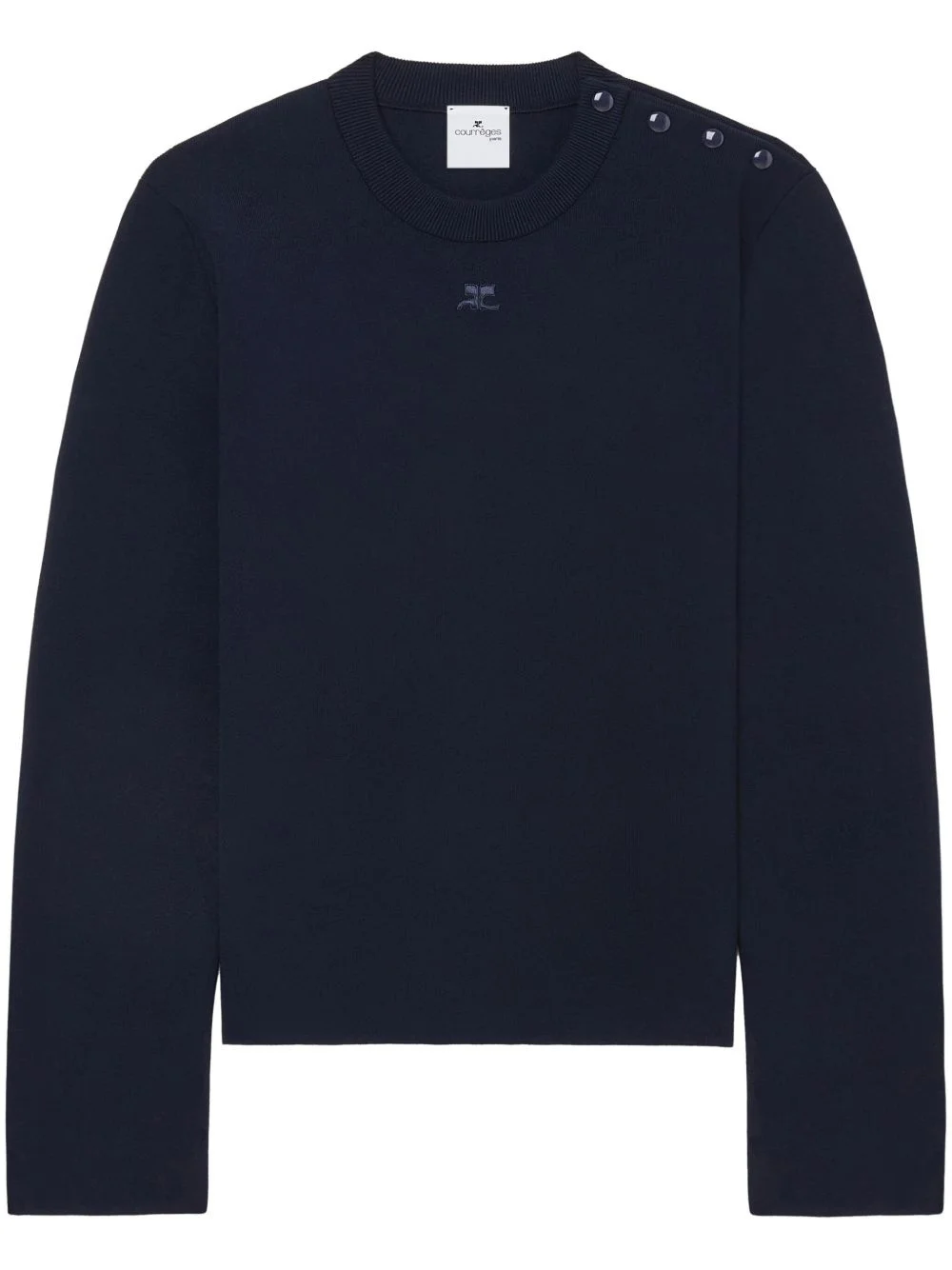 shoulder snaps sweater Highlights - Midnight blue - Jersey texture - Applique logo - Crew neck - Press-stud fastening at the shoulder - Long sleeves - Ribbed trim - Straight hem Imported Composition Viscose 70%, Polyester 30%