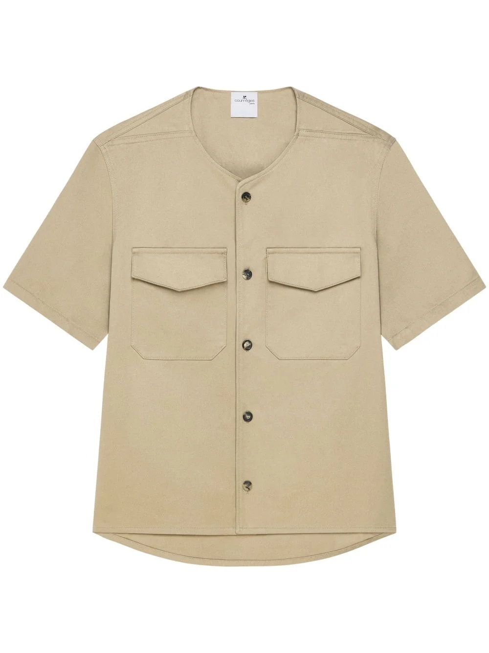utility shirt Highlights - Beige - Front button fastening - Two chest flap pockets - Collarless - Short sleeves - When buying this unisex item, keep in mind that it is graded in standard men's sizing. Imported Composition Polyester 65%, Cotton 35%