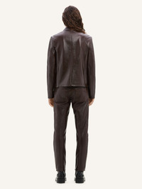 Long-sleeved vinyl biker jacket with stand-up collar. Shaded AC logo on chest. Zipped and center front pockets. The model is 1.85m tall and wears a size 48. DETAILS Composition: 88% cotton, 10% polyurethane, 2% elastane Country of Manufacture: SK SKU: 324CBL195VY00141983 Color: Chocolate