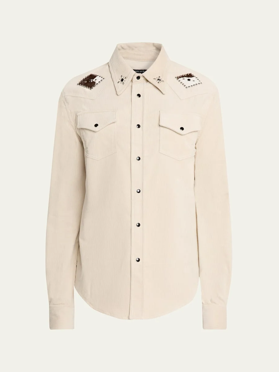 Cout De La Liberte western shirt crafted from premium European cotton, stud-embellished for a bold and unique finish Approx. 30"L from shoulder to hem Point collar Snap button front Snap button flap pockets Long sleeve; approx. 27.0"L Snap cuffs Western yoke Rounded hem Cotton/elastane Dry clean only Made in Italy Online Inquiries: BGS21_NDPP2| Store Inquiries: #5061818