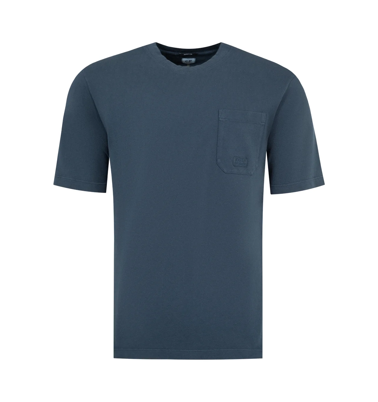 C.P. COMPANY 24/1 Piquet Pigment Dyed Short Sleeve T-Shirt featuring ribbed crewneck, chest open pocket with embroidered logo patch, side vents, pigment dyed and regular fit. 100% cotton. Made in Italy. DESIGNER STYLE ID: 20CMTS173A-005527S COLOR: 889 MIDNIGHT NAVY
