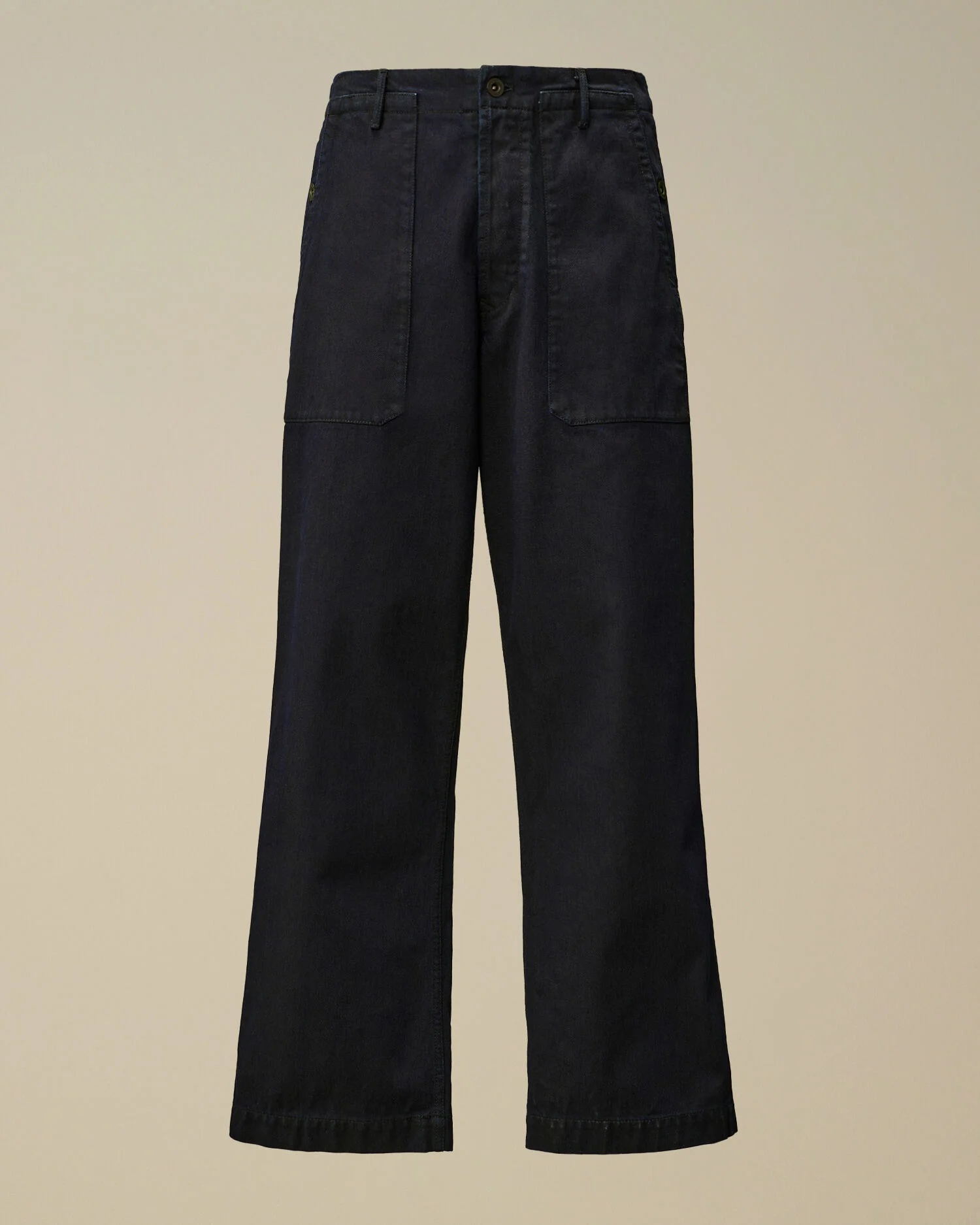 Loose pants crafted in 12 3/4 oz plated denim, woven in an indigo 3/1 twill. The pants feature a button fastening, belt loops, and side button adjusters. Additional features include side button pockets and back flap button pockets with an embroidered British Sailor logo patch. Loose fit. - Button fastening - Belt loops - Side button adjusters - Side button pockets - Back flap button pockets with embroidered British Sailor logo patch - Loose fit CARE & COMPOSITION Care - Wash max 30°C - Very mild process - Do not bleach - Do not tumble dry - Ironing maximum temperature 110°C - without steam - Do not dry clean - Line dry in the shade - Fabric may release color - wash separately and inside out - Do not expose the garment to direct sunlight or artificial light Composition - External fabric: 100% Cotton - Lining: 100% Cotton SIZE & FITTING - Fits true to size, take your normal size - Model is 186 cm-6' 1"/ 88-91 cm waist and is wearing a size 48 PRODUCT PASSPORT PRODUCT - Weaving: Italy - Dyeing: Italy - Confection: Romania PACKAGING - Minimum percentage of recycled materials 70%