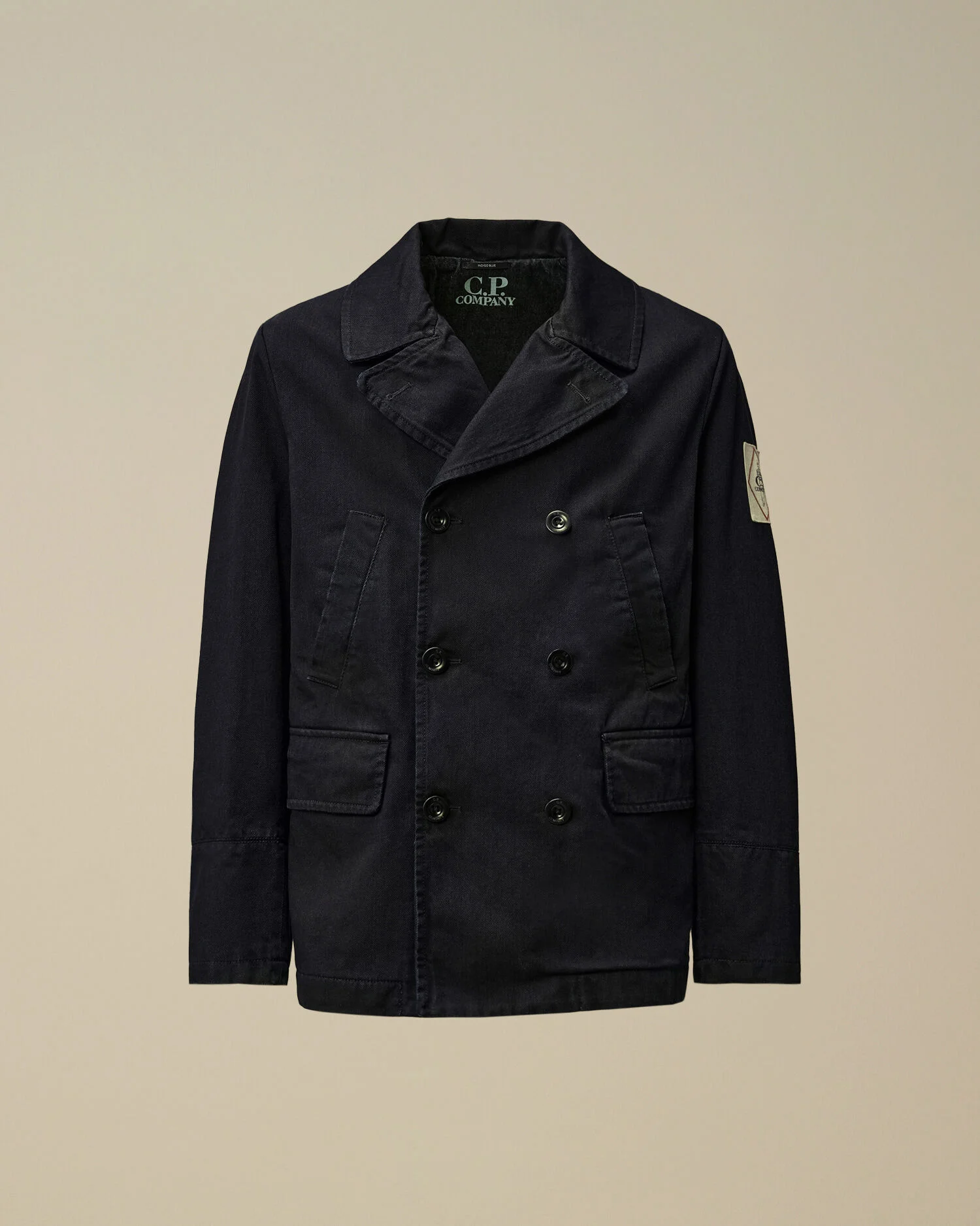 Pea coat crafted in 12 3/4 oz plated denim, woven in an indigo 3/1 twill. The coat features a notched rever collar, double-breasted closure, and chest open pockets. Finished with front flap pockets and an embroidered British Sailor logo patch on the sleeve. Regular fit. - Rever collar - Double-breasted closure - Chest open pockets - Front flap pockets - Sleeve embroidered British Sailor logo patch - Regular fit CARE & COMPOSITION Care - Wash max 30°C - Very mild process - Do not bleach - Do not tumble dry - Ironing maximum temperature 110°C - without steam - Do not dry clean - Line dry in the shade - Do not iron decorations - Fabric may release color - wash separately and inside out - Do not soak - Do not expose the garment to direct sunlight or artificial light Composition - External fabric: 100% Cotton - Lining: 65% Polyester, 35% Cotton - Secondary lining: 100% Cotton SIZE & FITTING - Fits true to size, take your normal size - Model is 186 cm-6' 1" / 98-103 cm chest and is wearing a size L PRODUCT PASSPORT PRODUCT - Weaving: Italy - Dyeing: Italy - Confection: Romania PACKAGING - Minimum percentage of recycled materials 70%