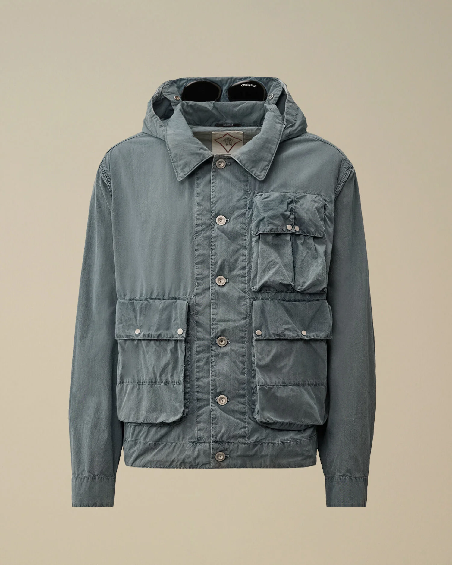 Goggle jacket crafted from 50 Fili, the iconic C.P. Company nylon/cotton fabric, treated with an indigo-dyeing and bleaching process for unique tonal variations. The model features a detachable and adjustable Goggle hood, button fastening, and chest and front flap pockets with snap closures. Completed with adjustable button cuffs, back button adjusters, and logo patches applied to the back and inner side. Regular fit. - Detachable and adjustable Goggle hood - Button fastening - Chest and front flap snap pockets - Adjustable button cuffs - Back button adjusters - Back and inner applied logo patch - Regular fit CARE & COMPOSITION Care - Wash max 30°C - Mild process - Do not bleach - Do not tumble dry - Ironing maximum temperature 110°C - without steam - Do not dry clean - Line dry in the shade - Fabric may release color - wash separately and inside out - Remove detachable accessories before washing - Do not expose the garment to direct sunlight or artificial light Composition - External fabric: 67% Cotton, 33% Polyamide / Nylon - Lining: 100% Cotton SIZE & FITTING - Model is 186 cm-6' 1" and is wearing a size L - Fit: Regular PRODUCT PASSPORT PRODUCT - Weaving: Japan - Dyeing: Japan - Confection: Romania PACKAGING - Minimum percentage of recycled materials 70%