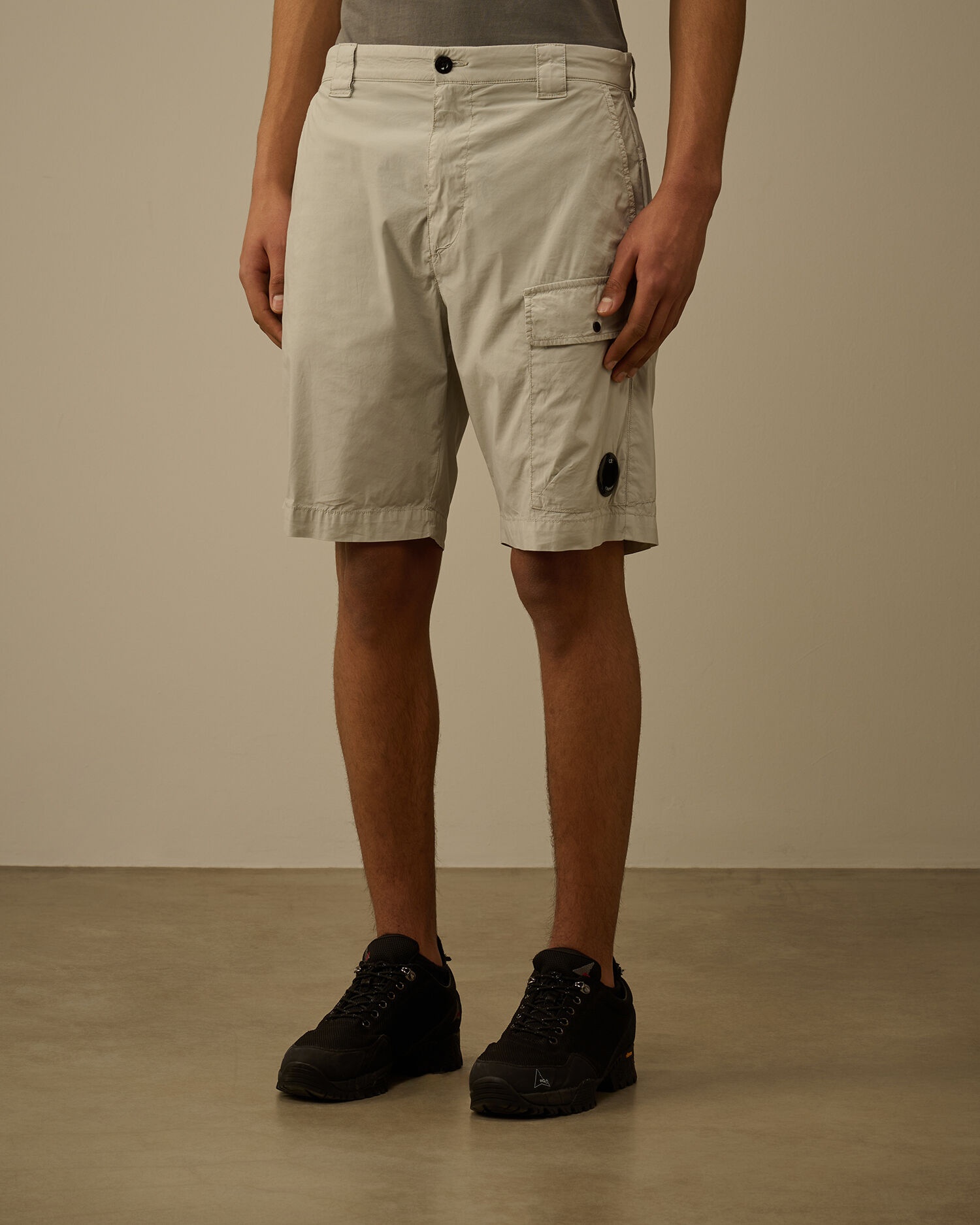 Cargo shorts crafted in 50 Fili Stretch, double garment dyed and anti-drop treated. 50 Fili is C.P. Company’s iconic nylon/cotton fabric, updated in this version with nylon stretch for added comfort. Lens detail. Regular fit. - Button and zip fastening - Belt loops - Side pockets - Cargo flap snap pocket with Lens detail - Back zip pocket with applied logo label - Double garment dyed - Regular fit CARE & COMPOSITION Care - Wash max 30°C - Mild process - Do not bleach - Do not tumble dry - Ironing maximum temperature 110°C - without steam - Do not dry clean - Line dry in the shade - Wash separately - Wash with similar colours - Wash inside out - Remove detachable accessories before washing Composition - External fabric: 65% Cotton, 28% Polyamide / Nylon, 7% Elastane / Spandex SIZE & FITTING - Fits true to size, take your normal size - Model is 186 cm-6' 1" / 88-91 cm waist and is wearing a size 48 PRODUCT PASSPORT PRODUCT - Weaving: Italy - Dyeing: Romania - Confection: Romania PACKAGING - Minimum percentage of recycled materials 70%
