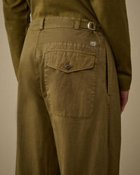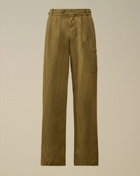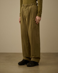 Cargo pants crafted from 50 Fili Wax, the iconic nylon and cotton fabric by C.P. Company, presented here in a version featuring a semi-transparent, water-resistant synthetic wax-effect coating. The polyurethane outer layer enhances the fabric’s protection against the elements. The model features a button and hidden zip fastening, adjustable internal elastic drawcords, and belt loops with side adjusters. The design is completed by side pockets, a cargo pocket with flap and snap closure enhanced by an embroidered logo, and a back patch pocket with flap and button closure. A logo label applied on the back. Garment dyed with a double dyeing process, in which the nylon and cotton fibres are dyed in different colours to create unique tonal contrasts and depth. Finished with an anti-drop treatment. Made in Italy. Loose fit. - Button closure with hidden zip fastening - Internal elastic drawcords - Belt loops with side adjusters - Side pockets - Cargo snap pocket with embroidered logo - Back patch flap button pocket - Back applied logo label - Made in Italy - Double garment dyed - Loose fit CARE & COMPOSITION Care - Wash max 30°C - Mild process - Do not bleach - Do not tumble dry - Ironing maximum temperature 110°C - without steam - Do not dry clean - Line dry - Wash separately - Wash inside out - Iron with a cloth between Composition - External fabric: 75% Cotton, 25% Polyamide / Nylon - Coating: 100% Polyurethanic resin SIZE & FITTING - Model is 188 cm-6' 2" and is wearing a size 48 - Fit: Loose PRODUCT PASSPORT PRODUCT - Weaving: Italy - Dyeing: Italy - Confection: Bulgaria PACKAGING - Minimum percentage of recycled materials 70%