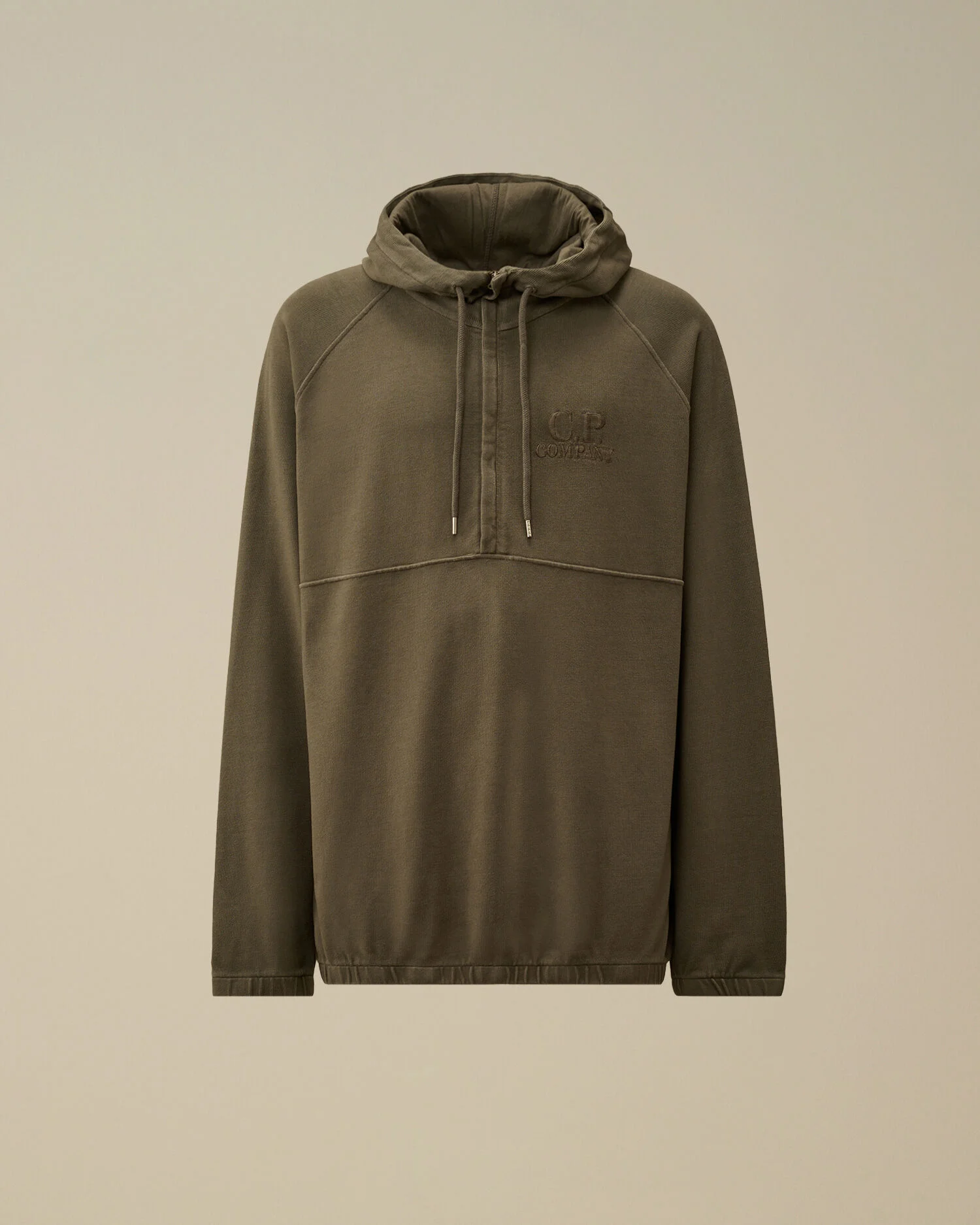 Half zip hooded sweatshirt crafted in Acero Fleece. The sweatshirt features an adjustable hood, and chest embroidered logo detail. Complete with raglan sleeves, elasticated cuffs, and hem. Regular fit. - Adjustable hood - Hidden half zip fastening - Chest embroidered logo detail - Raglan sleeves - Elasticated cuffs and hem - Garment dyed - Regular fit CARE & COMPOSITION Care - Wash max 30°C - Do not bleach - Do not tumble dry - Ironing maximum temperature 150°C - Do not dry clean - Dry flat - Wash separately - Wash with similar colours - Wash inside out - Iron inside out - Do not iron decorations - Do not expose the garment to direct sunlight or artificial light Composition - External fabric: 100% Cotton SIZE & FITTING - Fits true to size, take your normal size - Model is 186 cm-6' 1" / 98-103 cm chest and is wearing a size L PRODUCT PASSPORT PRODUCT - Weaving: Turkiye - Dyeing: Turkiye - Confection: Turkiye PACKAGING - Minimum percentage of recycled materials 70%
