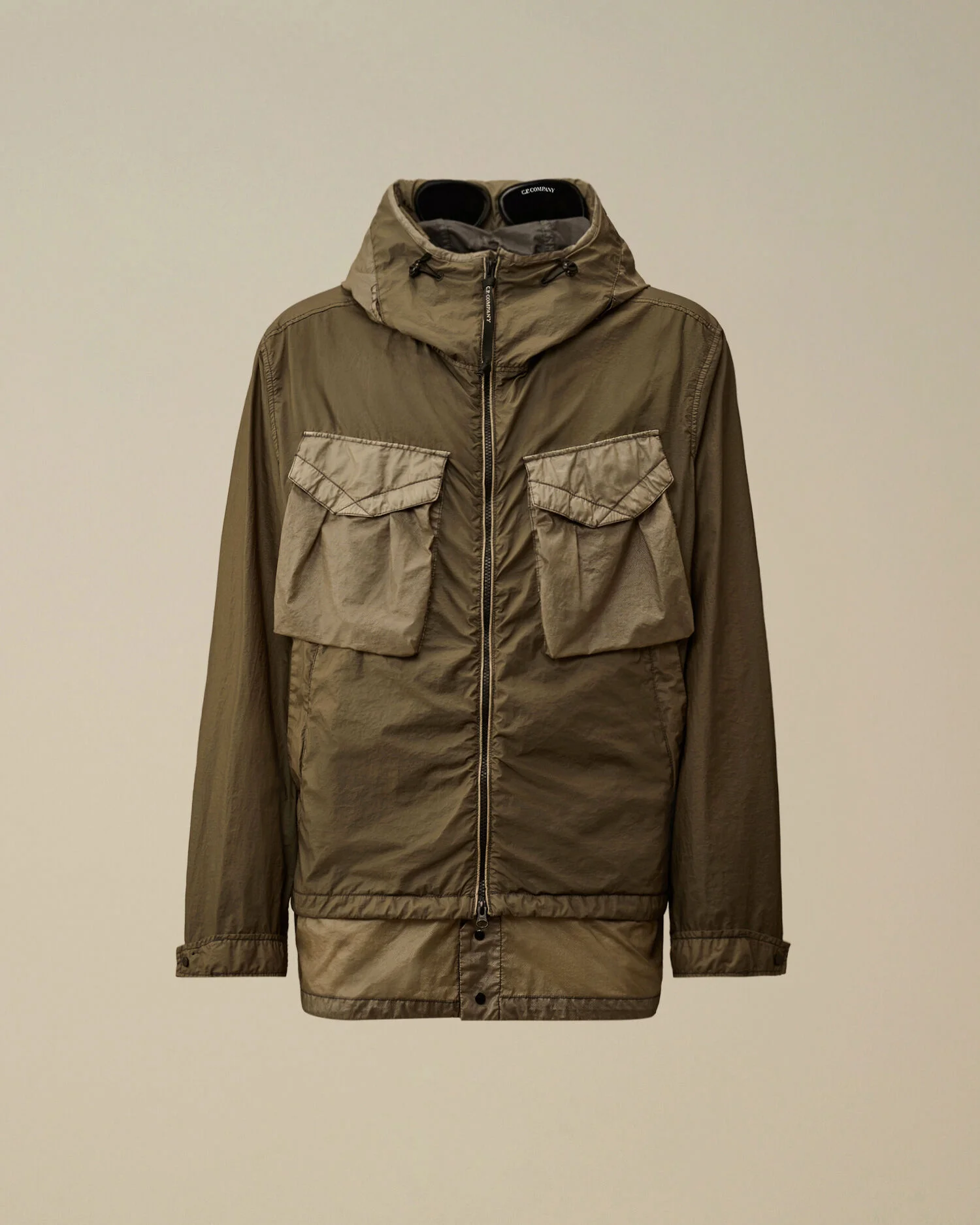 Goggle jacket crafted from Bi-TM Mixed, a 20D nylon with a polyurethane coating and a matte velour texture. The model features an adjustable and detachable Goggle hood in Opal, a two-way full zip fastening, and chest flap pockets in the same contrasting Opal fabric. Completing the design are side flap zip pockets, adjustable snap cuffs, and a bottom insert in Opal with snap buttons. Garment dyed to achieve unique colour depth and tonal variations that evolve with time and wear. Regular fit. - Adjustable and detachable Goggle hood in Opal - Two-way full zip fastening - Chest flap snap pockets in Opal - Side flap zip pockets - Adjustable snap cuffs - Adjustable drawstring hem - Bottom insert in Opal with snap buttons - Garment dyed - Regular fit CARE & COMPOSITION Care - Wash max 30°C - Mild process - Do not bleach - Do not tumble dry - Ironing maximum temperature 110°C - without steam - Do not dry clean - Line dry in the shade - Wash separately - Wash inside out - Iron with a cloth between - Remove detachable accessories before washing Composition - External fabric: 100% Polyamide / Nylon - Coating: 100% Polyurethanic resin - Secondary fabric: 100% Polyamide / Nylon - Third fabric: 100% Polyamide / Nylon SIZE & FITTING - Model is 186 cm-6' 1" and is wearing a size L - Fit: Regular PRODUCT PASSPORT PRODUCT - Weaving: Italy - Dyeing: Italy - Confection: Bulgaria - Product contains at least 75% of recycled material - Releases plastic microfibers into the environment during washing PACKAGING - Minimum percentage of recycled materials 70%