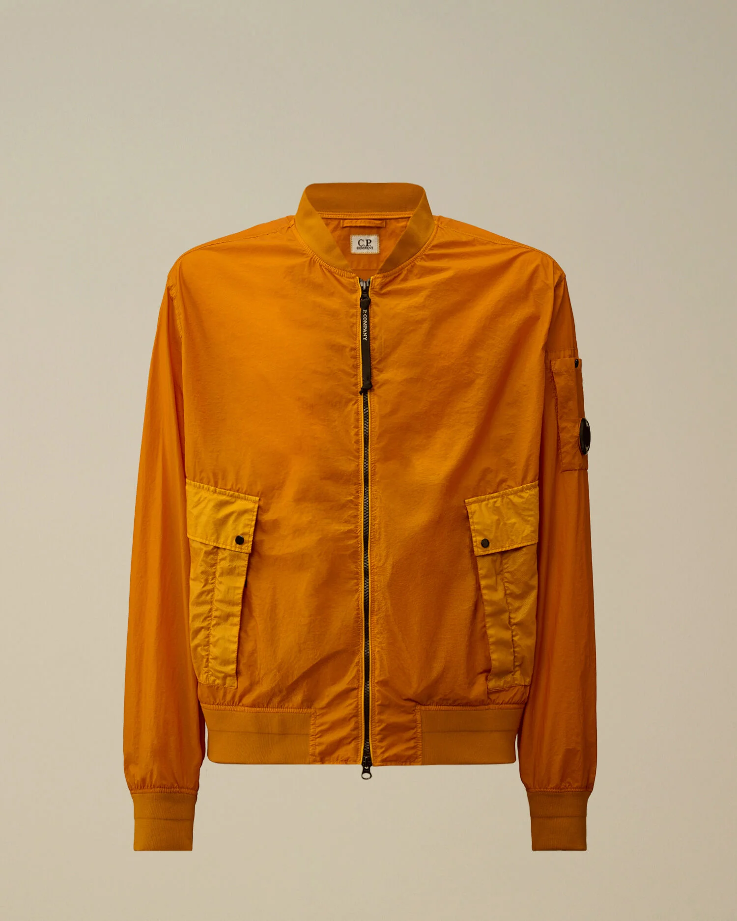 Bomber jacket crafted from Bi-TM Mixed, a 20D nylon with a polyurethane coating and a matte velour texture. The model features a ribbed collar, a two-way full zip fastening, and hidden side zip pockets complemented by contrasting side flap snap pockets in Opal fabric. Completing the design are the iconic C.P. Company Lens on the sleeve pocket, and ribbed cuffs and hem. Garment dyed to achieve unique colour depth and tonal variations that evolve with time and wear. Regular fit. - Ribbed collar - Two-way full zip fastening - Lens detail - Hidden side zip pockets - Side flap snap pockets in Opal - Ribbed cuffs and hem - Garment dyed - Regular fit CARE & COMPOSITION Care - Wash max 30°C - Mild process - Do not bleach - Do not tumble dry - Ironing maximum temperature 110°C - without steam - Do not dry clean - Line dry in the shade - Wash separately - Wash inside out - Iron with a cloth between - Remove detachable accessories before washing Composition - External fabric: 100% Polyamide / Nylon - Coating: 100% Polyurethanic resin - Secondary fabric: 100% Polyamide / Nylon - Third fabric: 100% Polyamide / Nylon SIZE & FITTING - Model is 186 cm-6' 1" and is wearing a size L - Fit: Regular PRODUCT PASSPORT PRODUCT - Weaving: Italy - Dyeing: Italy - Confection: Bulgaria - Product contains at least 70% of recycled material - Releases plastic microfibers into the environment during washing PACKAGING - Minimum percentage of recycled materials 70%