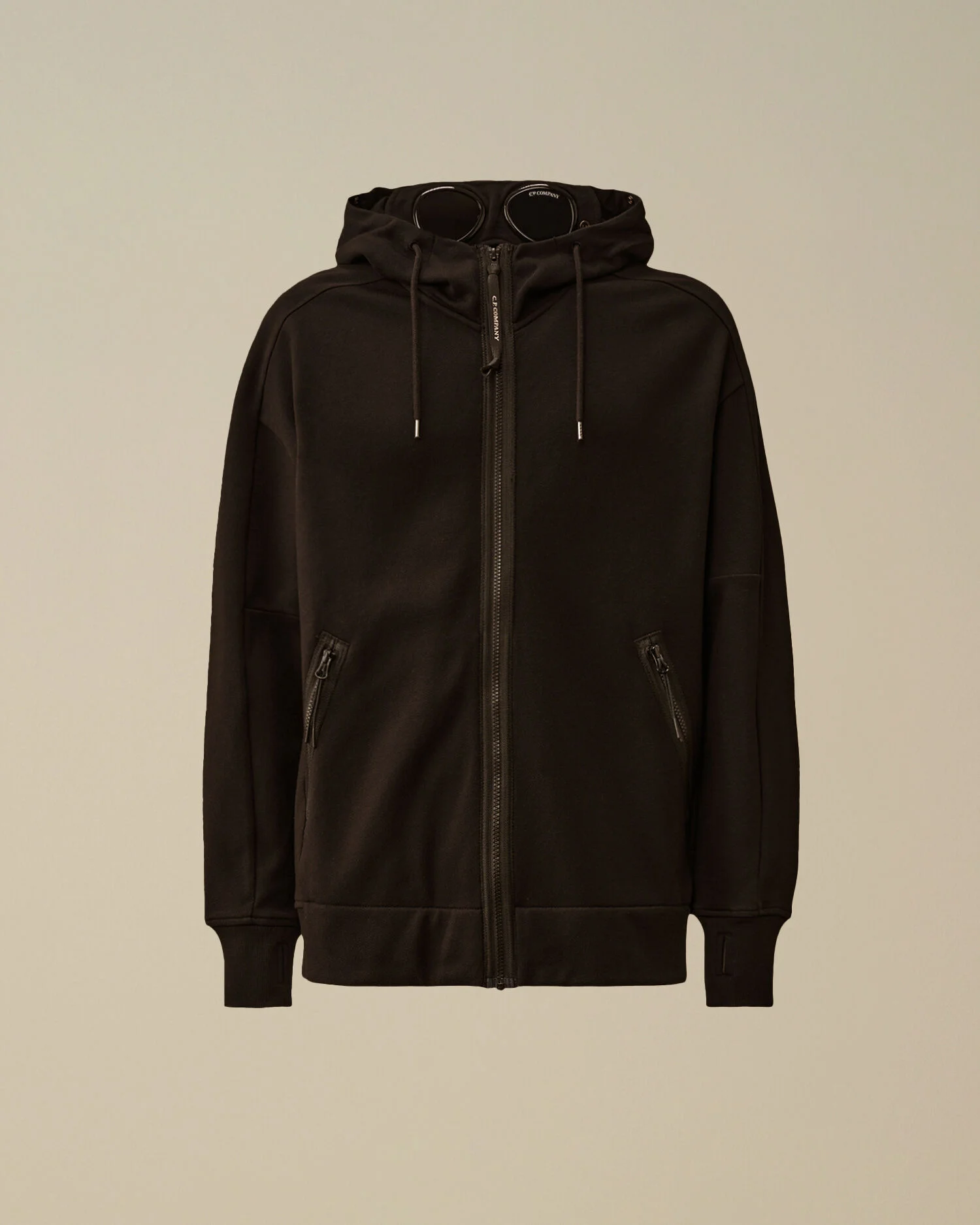 Goggle sweatshirt crafted in Diagonal Raised Fleece, a medium-weight brushed diagonal-weave cotton. The soft fabric ensures comfort and ease of movement. The sweatshirt features C.P. Company's iconic adjustable Goggle hood, side zip pockets, and ribbed cuffs and hem. Complete with a thumb hole on the cuffs. Regular fit. - Adjustable Goggle hood - Side zip pockets - Ribbed cuffs and hem - Thumb hole on cuffs - Regular fit CARE & COMPOSITION Care - Wash max 30°C - Do not bleach - Do not tumble dry - Ironing maximum temperature 110°C - without steam - Do not dry clean - Dry flat - Wash with similar colours - Wash inside out - Do not iron decorations - Do not expose to heat - Do not soak - Remove detachable accessories before washing - Dry inside out Composition - External fabric: 100% Cotton SIZE & FITTING - Fits true to size, take your normal size - Model is 186 cm-6' 1" / 98-103 cm chest and is wearing a size L PRODUCT PASSPORT PRODUCT - Weaving: China - Dyeing: China - Confection: Myanmar PACKAGING - Minimum percentage of recycled materials 70%