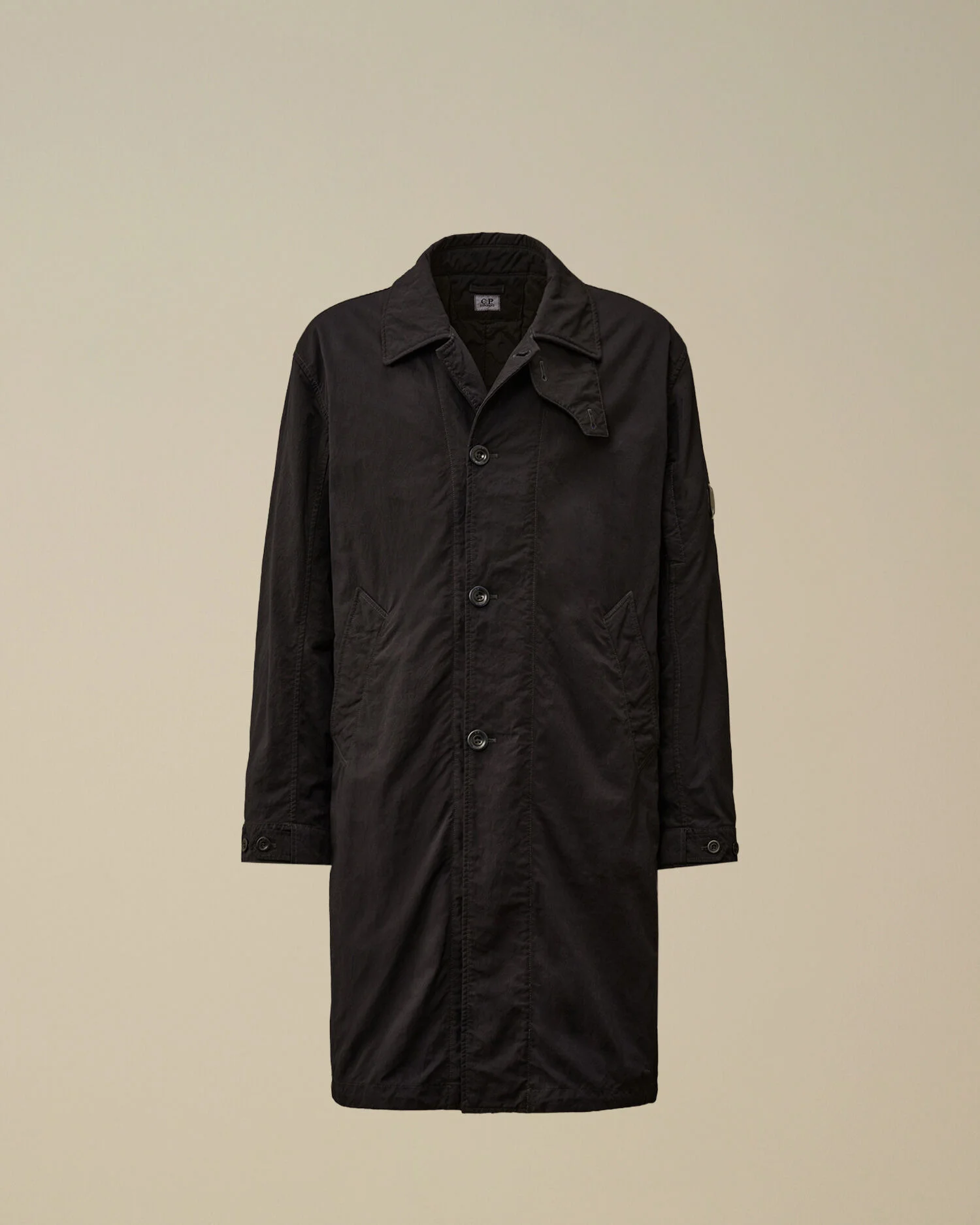 Fishtail padded coat crafted in heavy-duty left-hand twill, woven from two nylon taslan yarns. The coat features C.P. Company’s iconic Lens, a classic collar with a button placket, full button and snap fastening, and side pockets. Finished with a fishtail hem. Wadding padded and garment dyed. Regular fit. - Classic collar with button placket - Full button fastening with snap hem - Side pockets - Lens detail - Adjustable button cuffs - Fishtail hem - Garment dyed - Wadding padded - Regular fit CARE & COMPOSITION Care - Wash max 30°C - Mild process - Do not bleach - Do not tumble dry - Ironing maximum temperature 110°C - without steam - Do not dry clean - Line dry in the shade - Wash separately - Wash inside out - Do not soak - Remove detachable accessories before washing Composition - External fabric: 100% Polyamide / Nylon - Lining: 100% Polyamide / Nylon - Padding (Fiber): 100% Polyester - Secondary lining: 100% Polyamide / Nylon SIZE & FITTING - Fits true to size, take your normal size - Model is 186 cm-6' 1" / 98-103 cm chest and is wearing a size L PRODUCT PASSPORT PRODUCT - Weaving: Korea - Dyeing: Italy - Confection: Romania - Releases plastic microfibers into the environment during washing PACKAGING - Minimum percentage of recycled materials 70%