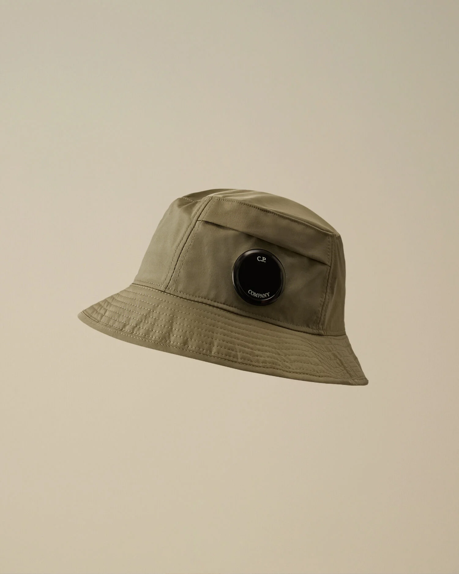 Bucket hat crafted in Chrome-R, a 100% recycled, shiny multifilament nylon. Made from production scraps reprocessed into a new fibre, certified by the Global Recycled Standard (GRS). The hat features a turn-up brim, a panelled construction, and a hidden snap pocket with C.P. Company’s iconic Lens. - Turn-up brim - Panelled construction - Lens detail with hidden snap pocket CARE & COMPOSITION Care - Wash max 30°C - Mild process - Do not bleach - Do not tumble dry - Do not iron - Do not dry clean - Line dry - Wash separately - Remove detachable accessories before washing Composition - Inner main fabric: 100% Polyester - External main fabric: 100% Polyamide / Nylon PRODUCT PASSPORT PRODUCT - Weaving: China - Dyeing: China - Confection: China - Product contains at least 55% of recycled material - Releases plastic microfibers into the environment during washing PACKAGING - Minimum percentage of recycled materials 70%